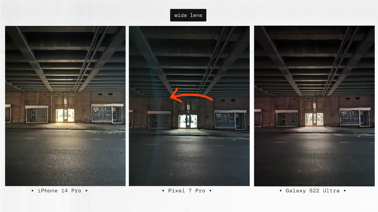 가장 핵심적인 영역이고 진정한 타이틀 매치가 이루어지는 그 메인 카메라 부분입니다. 그리고 이 파트에서 중요한 이야기가 하나 나오는데, 픽셀의 경우 저조도에서 뛰어난 결과를 보여주었던 것은 맞지만, 전체적인 촬영 테스트에서 다른 두 기종, 그러니까 아이폰14 프로와 S22 울트라 대비 확연히 떨어지는 결과를 보여주었다고 합니다.