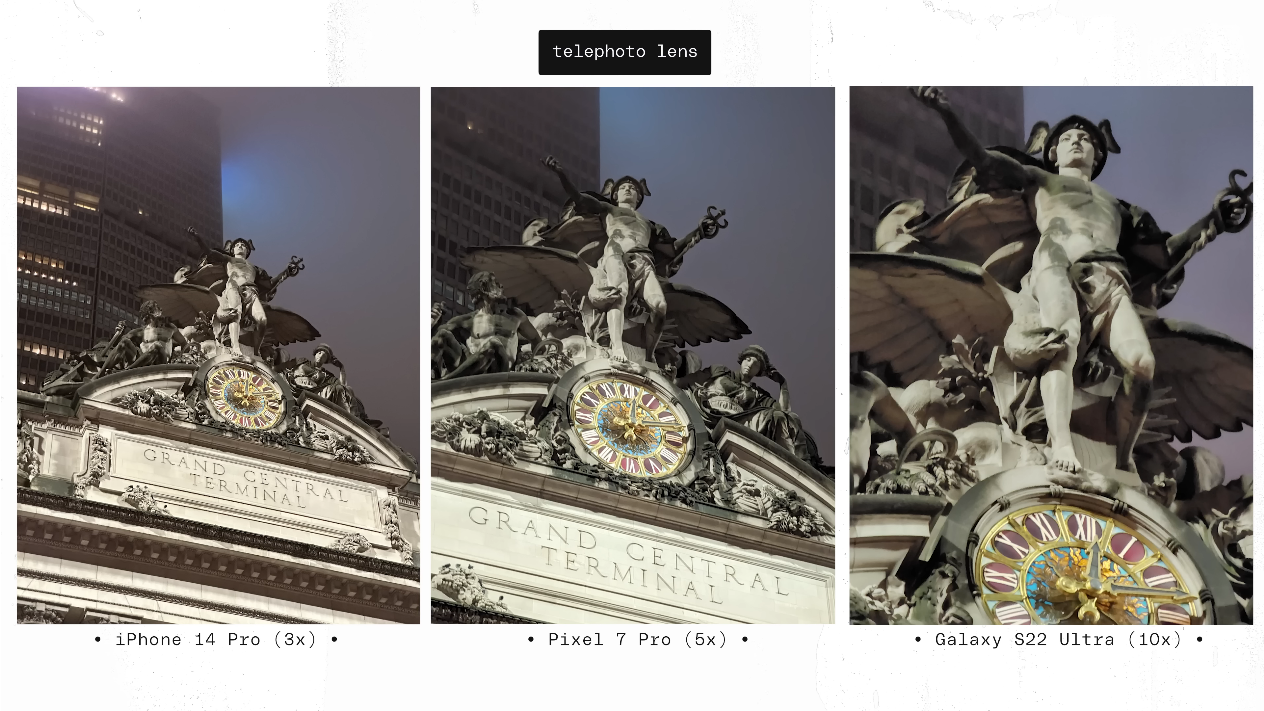 이 부분은 광학줌을 기준으로 테스트가 이루어졌습니다. 아이폰14프로는 3배, 픽셀7프로는 5배, 그리고 갤럭시 S22 울트라는 10배까지 가능하죠.