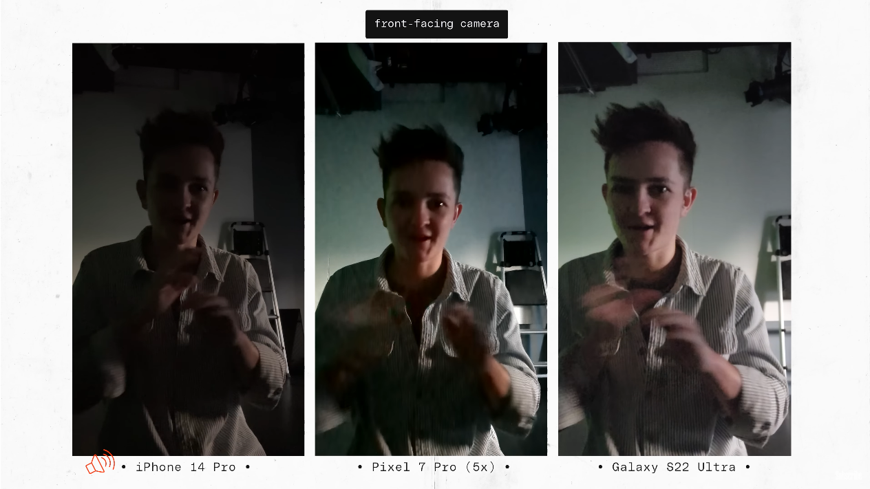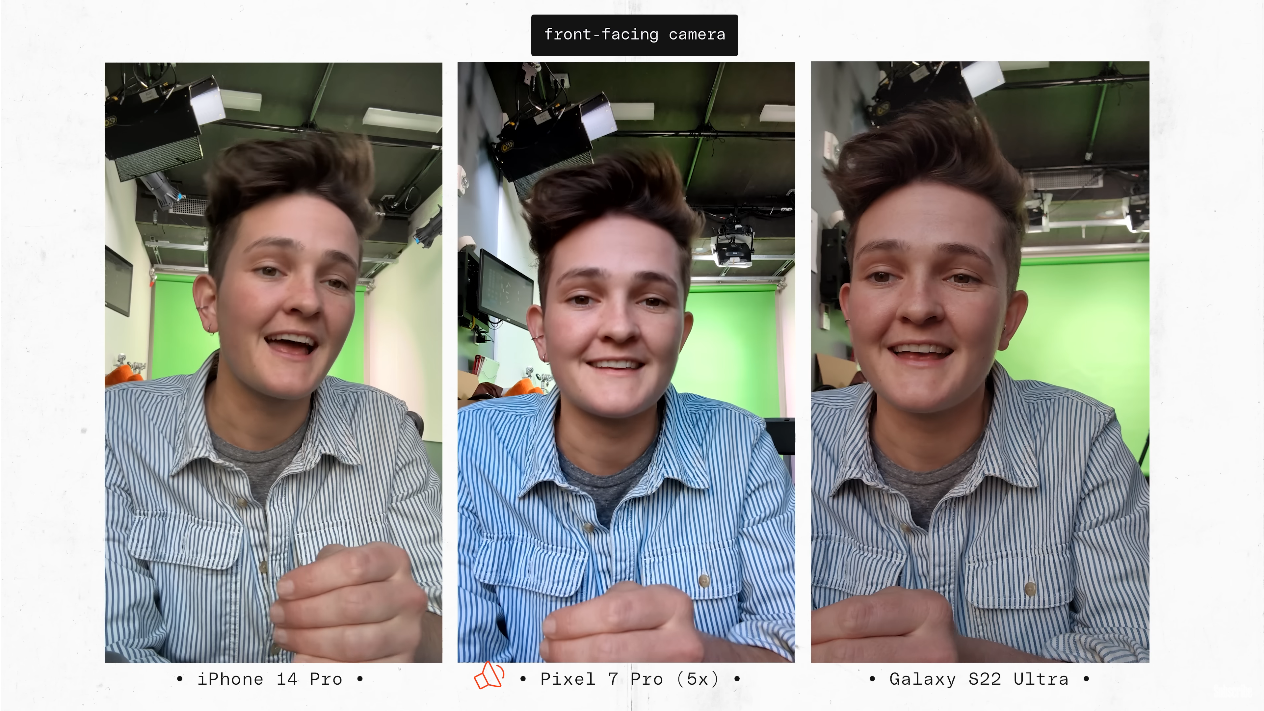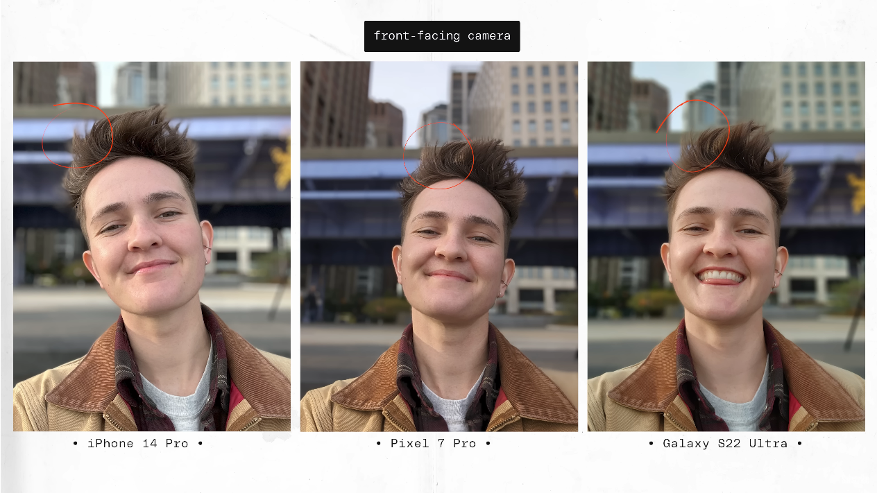 출처: the Verge https://youtu.be/iIBYa1ZEzFQ 전면 카메라를 두고서는 S22 울트라의 사진이 매우 선명한데, 아이폰14 프로의 전면 카메라 화질이 결코 선명하지 않은 건 아니지만, 갤럭시가 너무나 선명해서 오히려 그렇게까지는 선명하지 않은 아이폰을 선호한다고 이야기를 했습니다. 그리고 픽셀의 경우 너무 대비 (콘트라스트)가 높게 나온다고 지적했습니다.