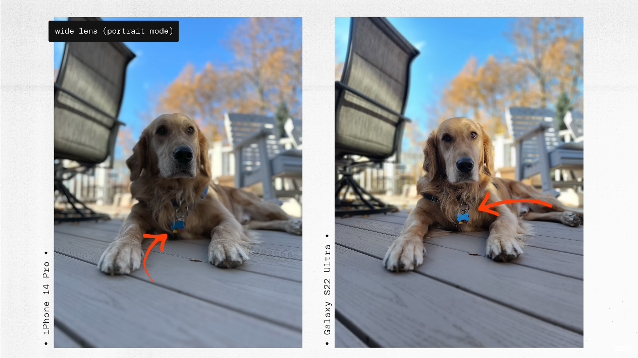 출처: the Verge https://youtu.be/iIBYa1ZEzFQ 아이폰의 경우 강아지를 대상으로 인지는 하였으나, 그 외 나머지를 전부 블러처리하여, 강아지 목걸이 부분도 선명하지 못 하게 처리 된 걸 알 수 있습니다. 반면 갤럭시는 전체를 피사체로 잘 잡아냈죠.