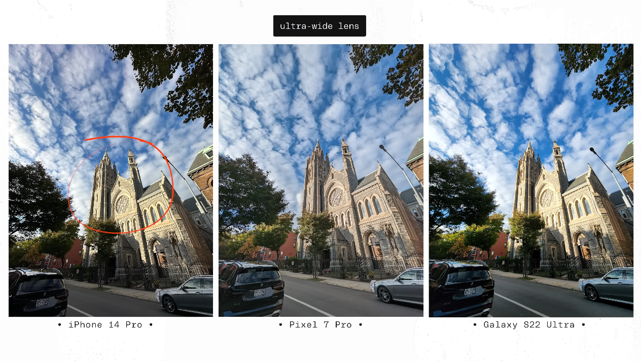 출처: the Verge https://youtu.be/iIBYa1ZEzFQ 두 사진을 통해서 아이폰14프로가 구름과 성당의 꼭대기 부분을 더 잘 표현했다고 평가했습니다. 그래서 아주아주아주 작은 차이지만, 이 부분 때문에 초광각 영역에서는 셋 중 아이폰14프로가 가장 낫다고 결론을 내렸습니다.