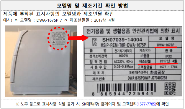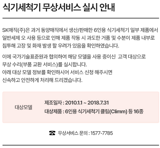 SK매직 (구 동양매직)에서 나온 6인용 식기 세척기 사용하시는 분들께서는 주의하셔야겠습니다. 일부 모델에서 고장이나 그로 인한 화재가 발생할 수 있는 우려가 발견되었다고 하고, 이로 인해 제조사에서는 해당 모델 사용자들을 대상으로 제품에 대한 리콜 차원에서 무상 수리를 진행한다고 밝혔습니다.
