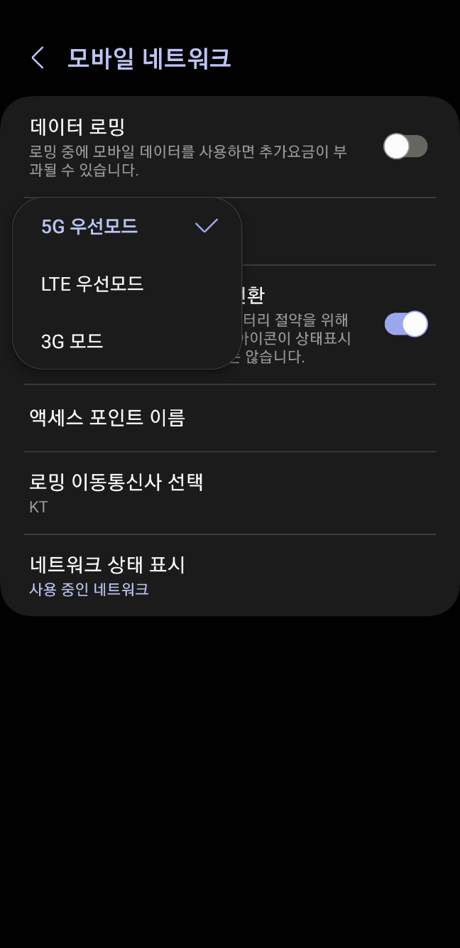설정 - 연결 - 네트워크 - 모바일 네트워크 - 모바일 네트워크 방식 여기에서 '5G 우선 모드'로 바꿔주시면 개발자 모드에 들어가더라도 튕기는 현상이 없을 겁니다.
