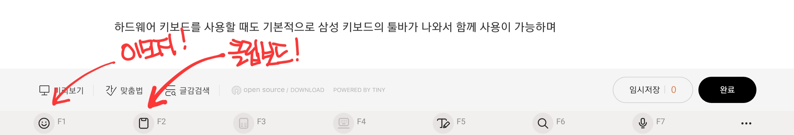 하드웨어 키보드를 사용할 때도 위의 화면처럼 기본적으로 삼성 키보드의 툴바가 나와서 함께 사용이 가능해졌다는 것이 특징입니다. 그래서 기존에 블루투스 키보드를 사용할 때 불편했던 이모지나 클립보드 사용 등에서 훨씬 더 편리하고 최적화된 사용자 경험을 제공합니다. 이 부분은 정말 매우매우 마음에 듭니다 🤩