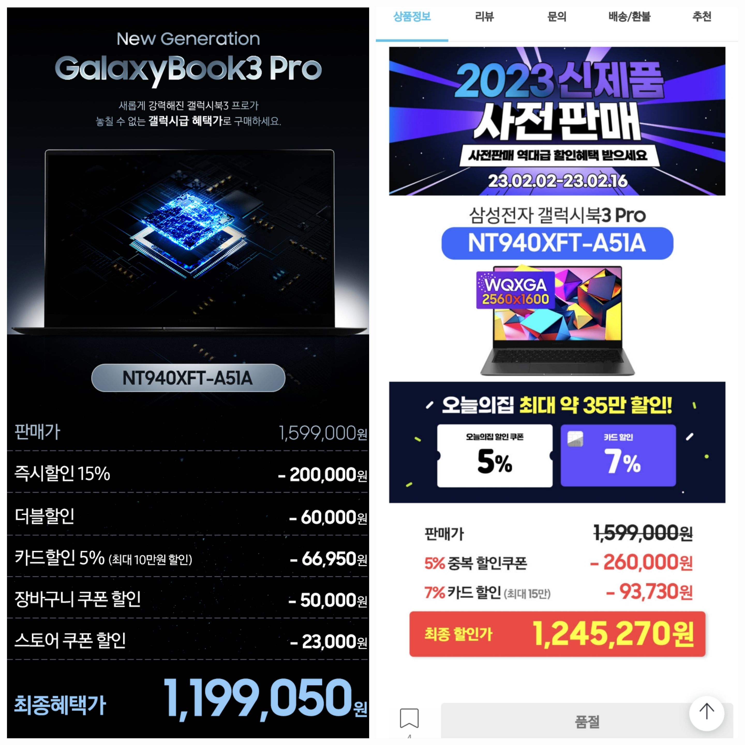 심지어는 할인을 다 더 했을 때 S23과 갤럭시북3 프로를 사도 그램 하나 값입니다.....ㅎㅎ;;