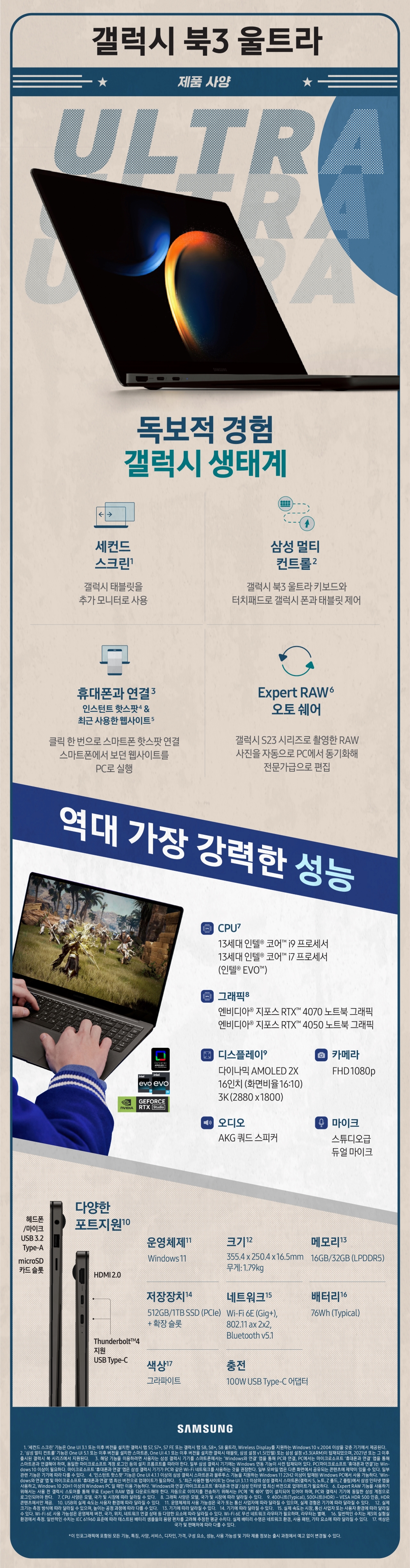 울트라 제품 기준으로 먼저 보면 인텔 13세대 고성능 H 프로세서, 엔비디아 지포스RTX 4050 혹은 4070, 기본 512기가 스스디, 기본 16기가 LPDDR5 램, 3k 올레드 가변주사율, 썬더볼트4 포트 2개, 메모리 리더기, 돌비 애트모스 지원 등 진짜 넣을 수 있는 건 다 넣었습니다 ㄷㄷㄷ '울트라'라는 이름에 맞게 작정하고 나온 모양새입니다.