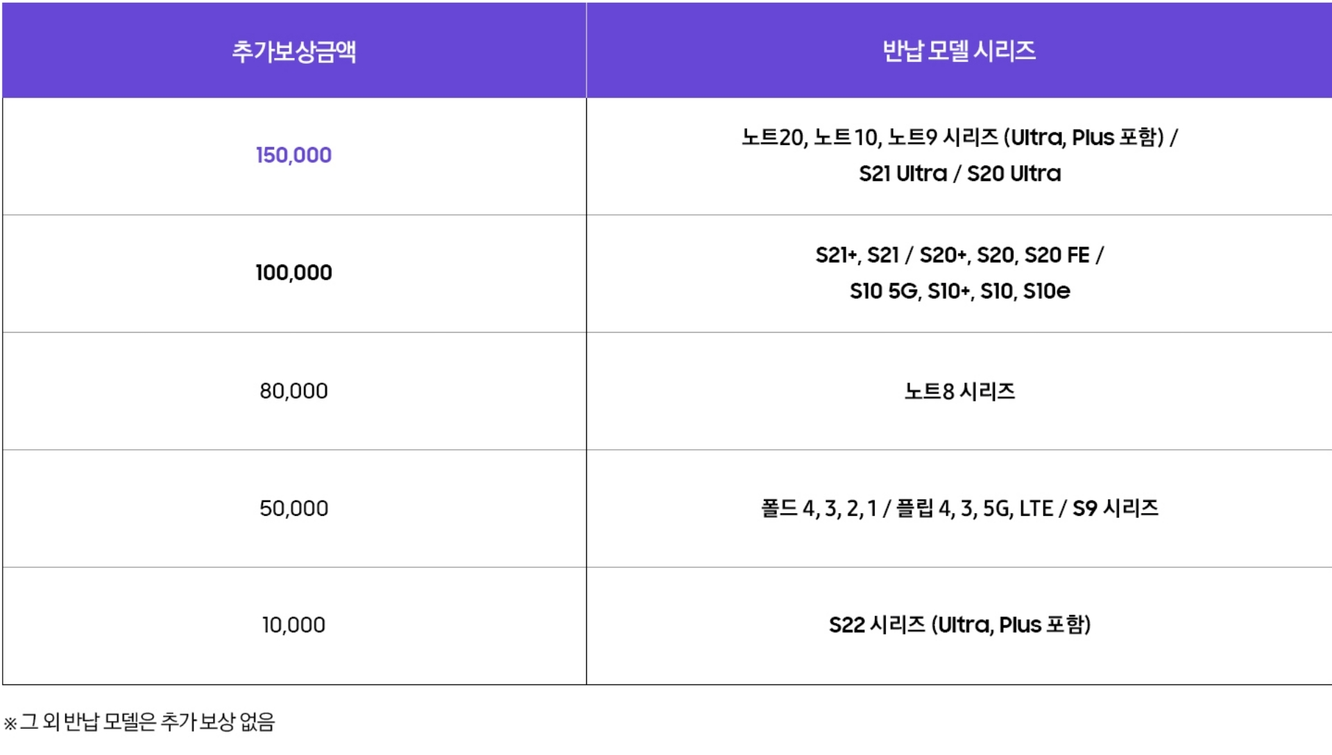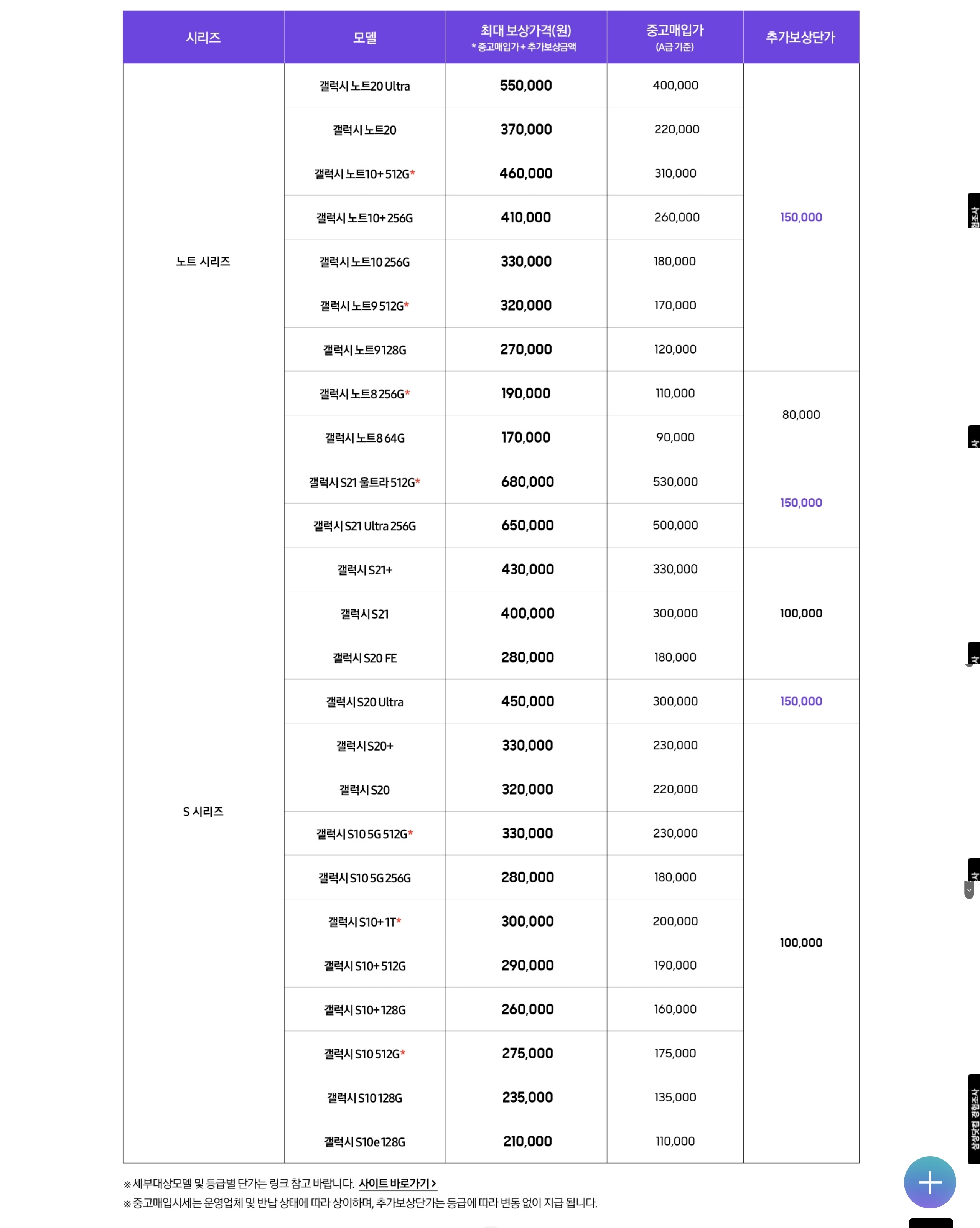 해당 보상 가격은 반납하는 제품의 상태에 따라서 달라질 수 있습니다. 그리고 S22 시리즈의 경우 아직 판매 중이면서 동시에 할인도 많이 하고 있어서 그런지 추가 보상 대상이 아니라는 걸 알 수 있습니다 (1만원은 그냥 형식적으로 등록해 놓은 걸로 보입니다)