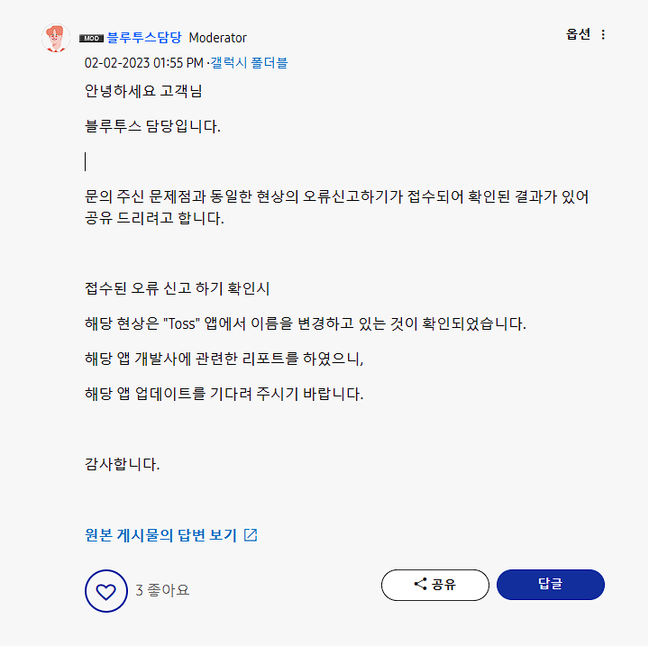 이에 관해서 삼성 멤버스 측에서 오류 로그를 분석하여 확인한 결과 토스 (Toss) 앱이 임의로 기기 이름을 friends 로 바꿔버리는 문제가 있다고 합니다 🤣