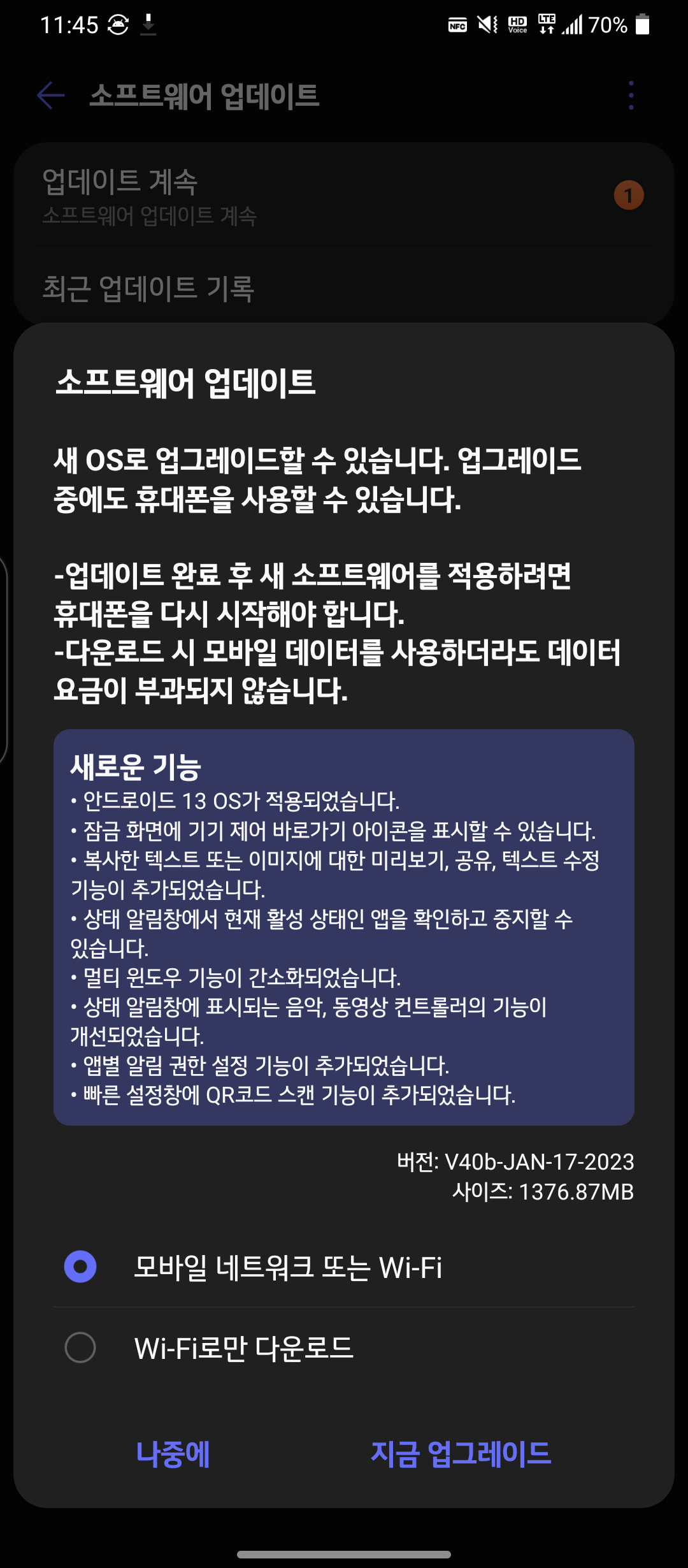 이번 업그레이드는 메이저 버전업답게 용량이 제법 됩니다. 대략 1.4GB이고, 데이터 무제한 요금제를 사용하는 분들이 아니시라면 와이파이를 통한 다운로드를 추천합니다.