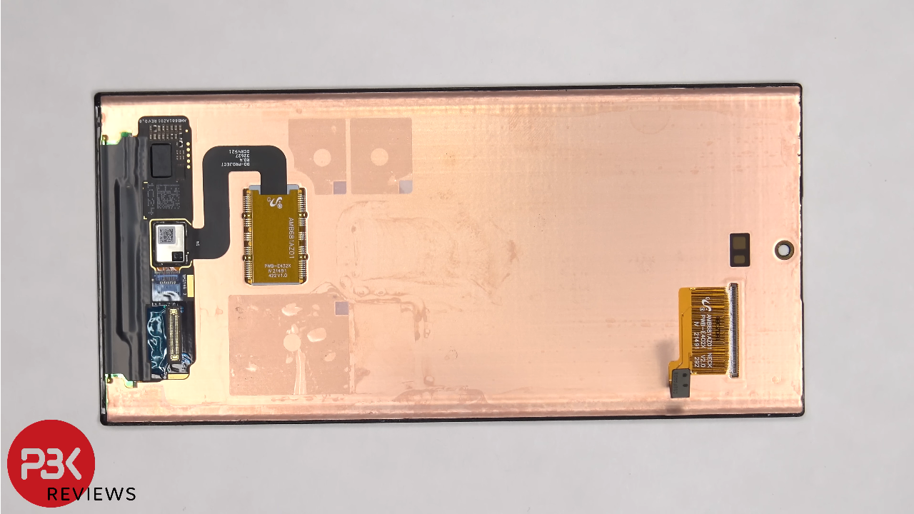 출처: Samsung Galaxy S22 Ultra Teardown Disassembly Repair Video Review (https://youtu.be/aC30DHRWB1A) 또, 이번에도 역시 기존처럼 디스플레이 영역 전체에 걸쳐서 구리판으로 방열 처리를 잘 해놓은 걸 알 수 있습니다. 마지막으로 이제 뒤집어서 안쪽을 보면 아래와 같습니다.