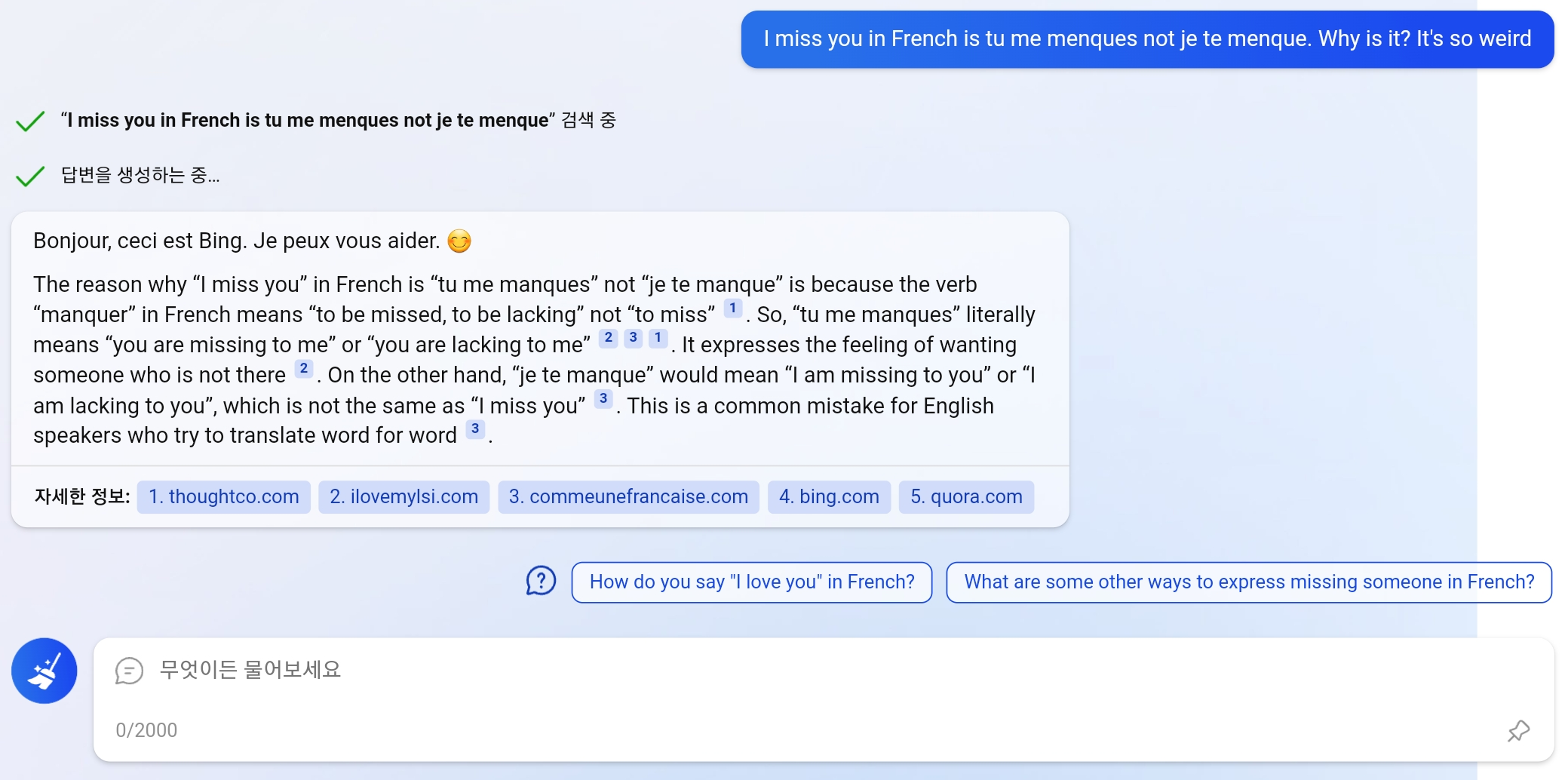 질문 자체를 별도의 따옴표 없이 써서, 일반적인 검색 엔진에서는 내용 구분을 못 했을텐데, 알아서 정확히 질문을 판별해냈고, 프랑스어에 관한 질문이라 첫인사를 프랑스어로 하는 등 놀라운 모습을 보여줍니다;;;;;; (무서워요 ㄷㄷㄷ) 그리고 각종 설명도 아주 이해하기 쉽게 하는데, 이번 새로운 빙 검색 답변의 특징도 잘 보입니다.