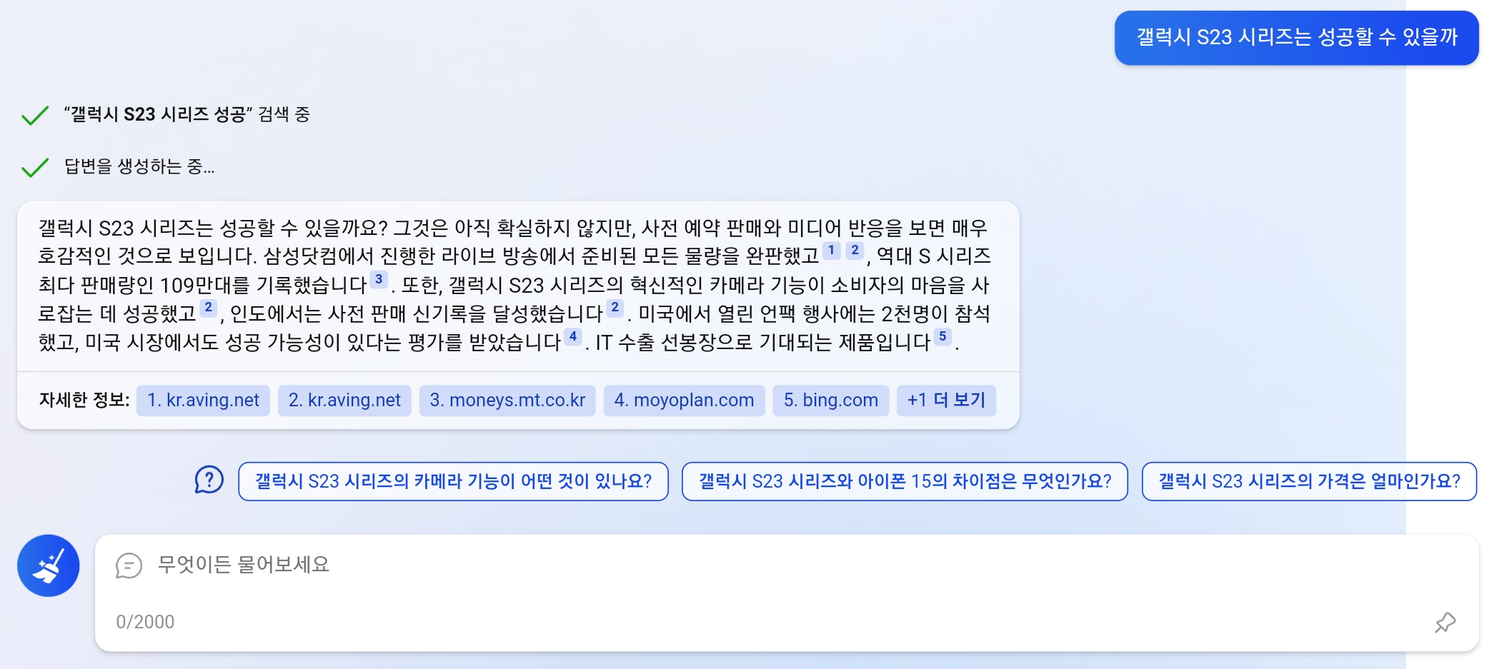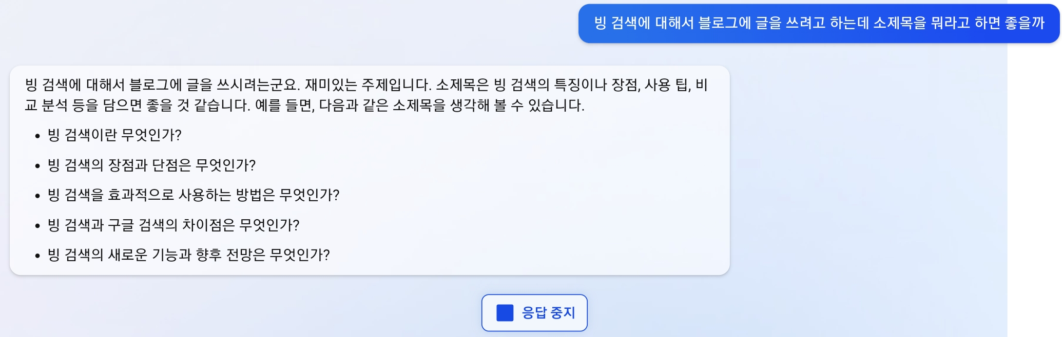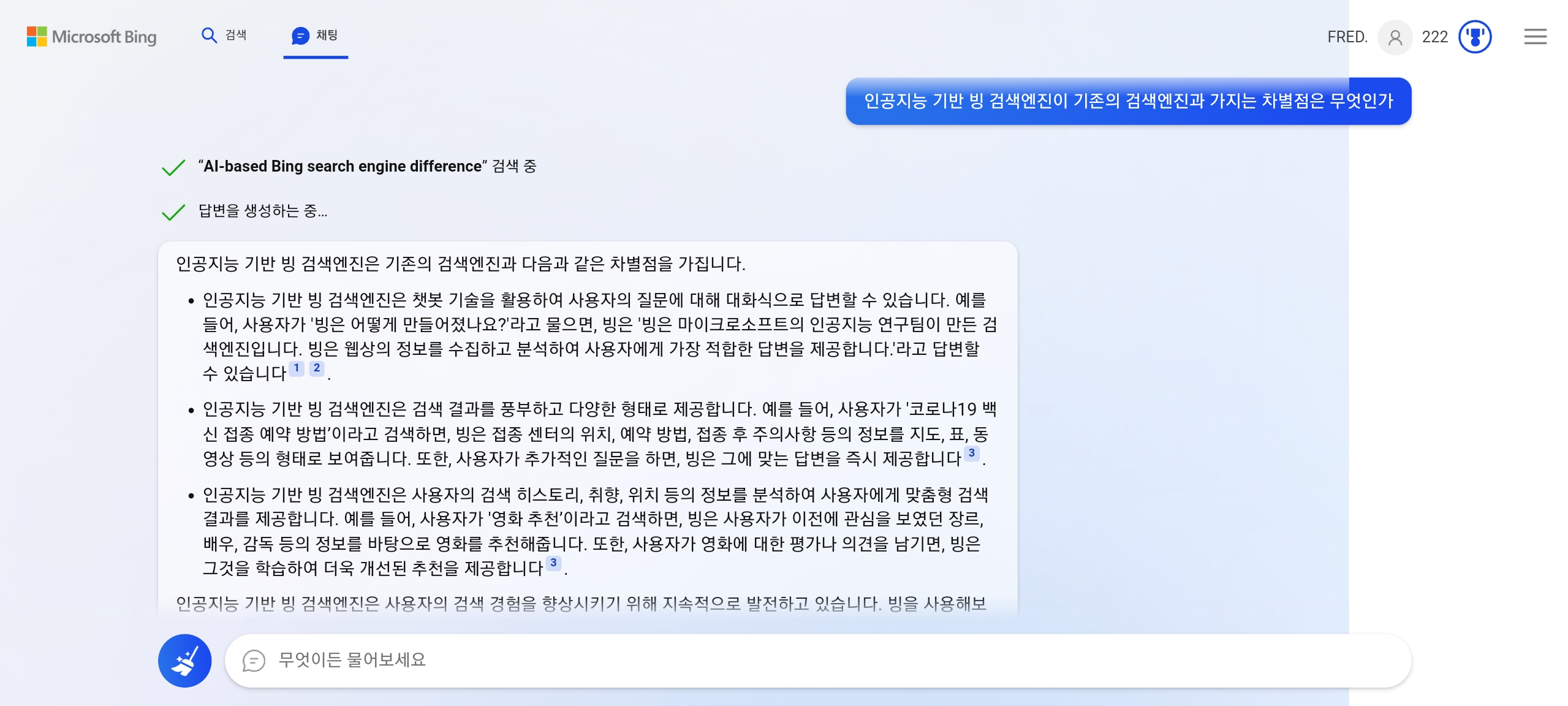 이번 빙 검색의 핵심이 바로 이 채팅기능입니다. AI와의 채팅 형식으로 질문에 대한 원하는 답을 얻을 수 있고, 그 답변에 대해서 추가적인 질문을 이어갈 수도 있습니다. 직접 검색해 본 몇 가지 사례들을 살펴볼까요?