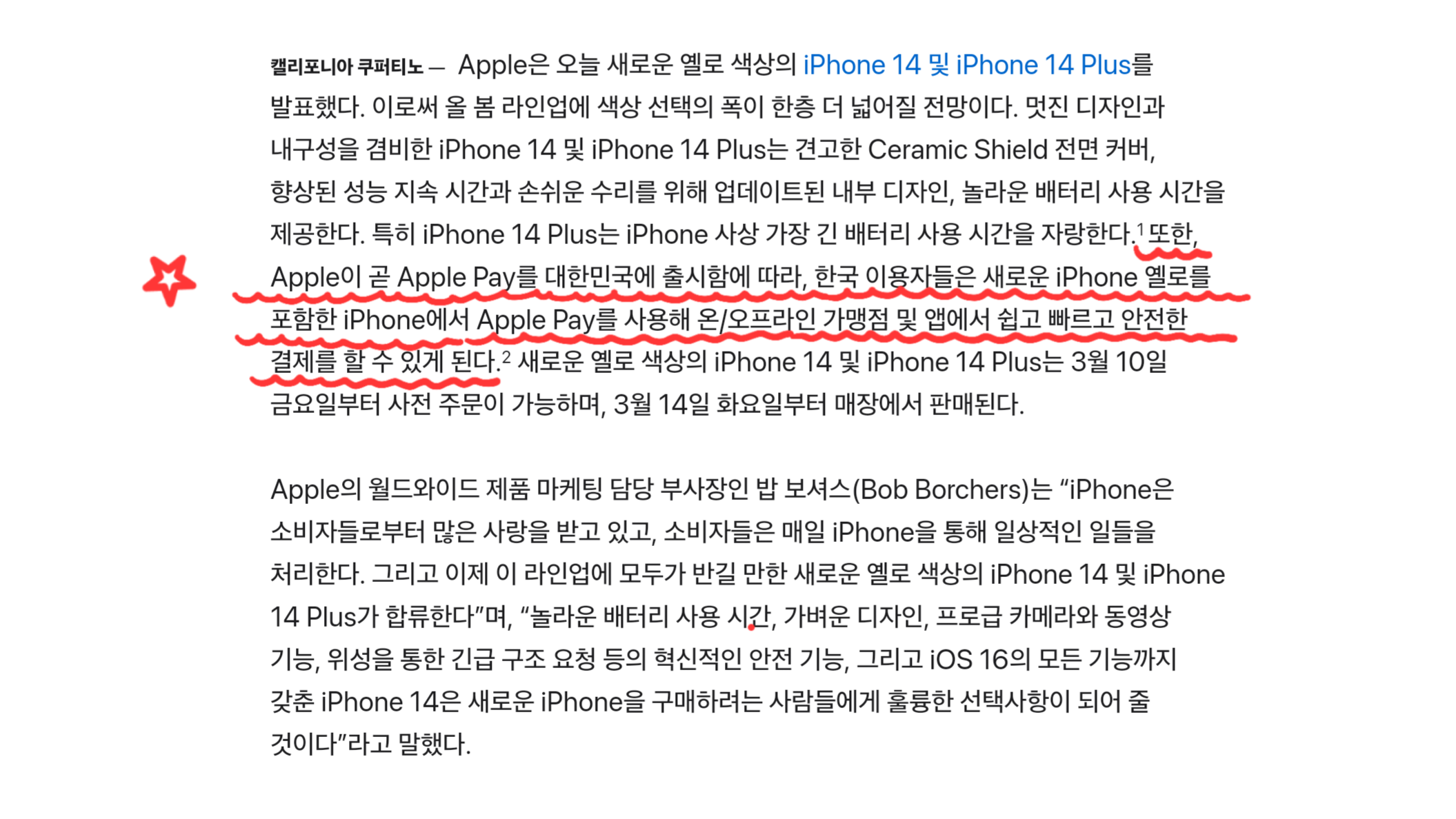 아이폰 14 시리즈의 신규 색상인 노랑이 추가 되면서 이에 대한 소식이 올라왔는데 그 가운데에 바로 애플페이 우리나라 런칭 언급이 명확하게 되어 있습니다. 이로써 국내 서비스 시작 자체는 다시 한번 확인이 된 셈이죠.