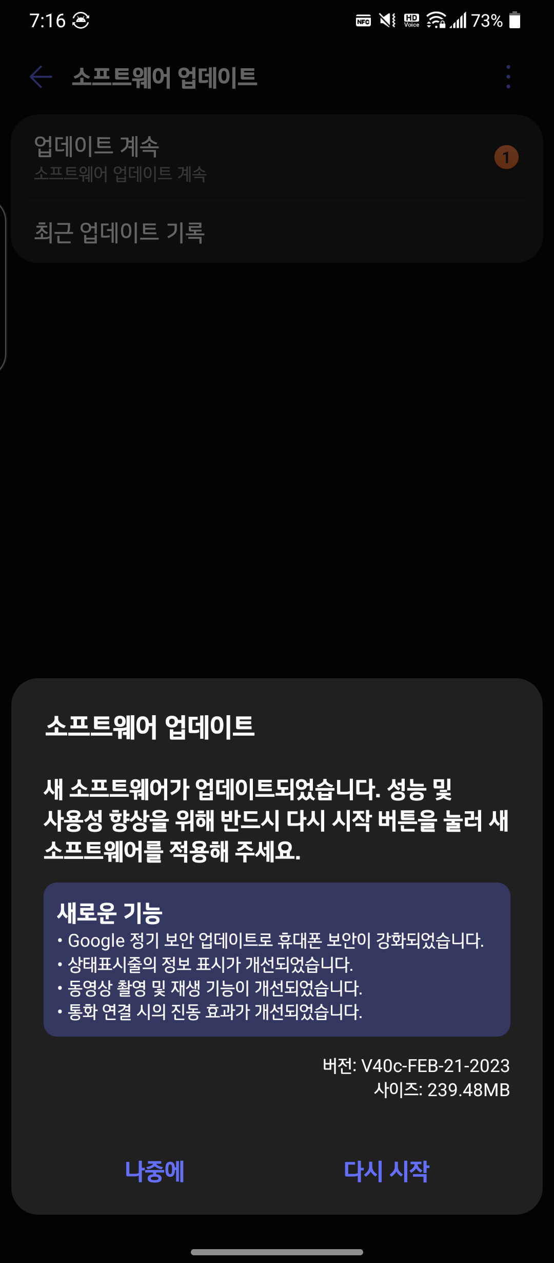 오늘 (2023년 3월 16일) 난데 없이 제 업무용 세컨드 폰 엘지 벨벳에서 업데이트가 뜨더군요.....! 업데이트 내용은 다음과 같습니다.