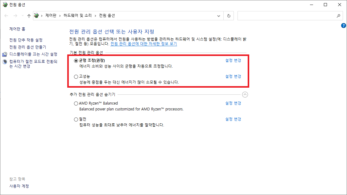 이 부분이 AMD Ryzen Balanced 라는 값으로 선택이 되어 있을 겁니다. 이거를 '균형 조정' 혹은 필요에 따라 '고성능'으로 바꿔서 사용해도 프리징이 발생하는지 확인해 보세요. 많은 경우 이걸 바꾸면 해결이 될 겁니다.