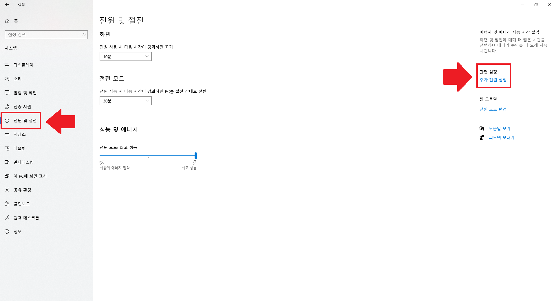 '전원 및 절전' 탭으로 가신 다음 오른쪽에 '추가 전원 설정'이라고 되어 있는 부분을 누르면 아래와 같은 화면이 나옵니다.