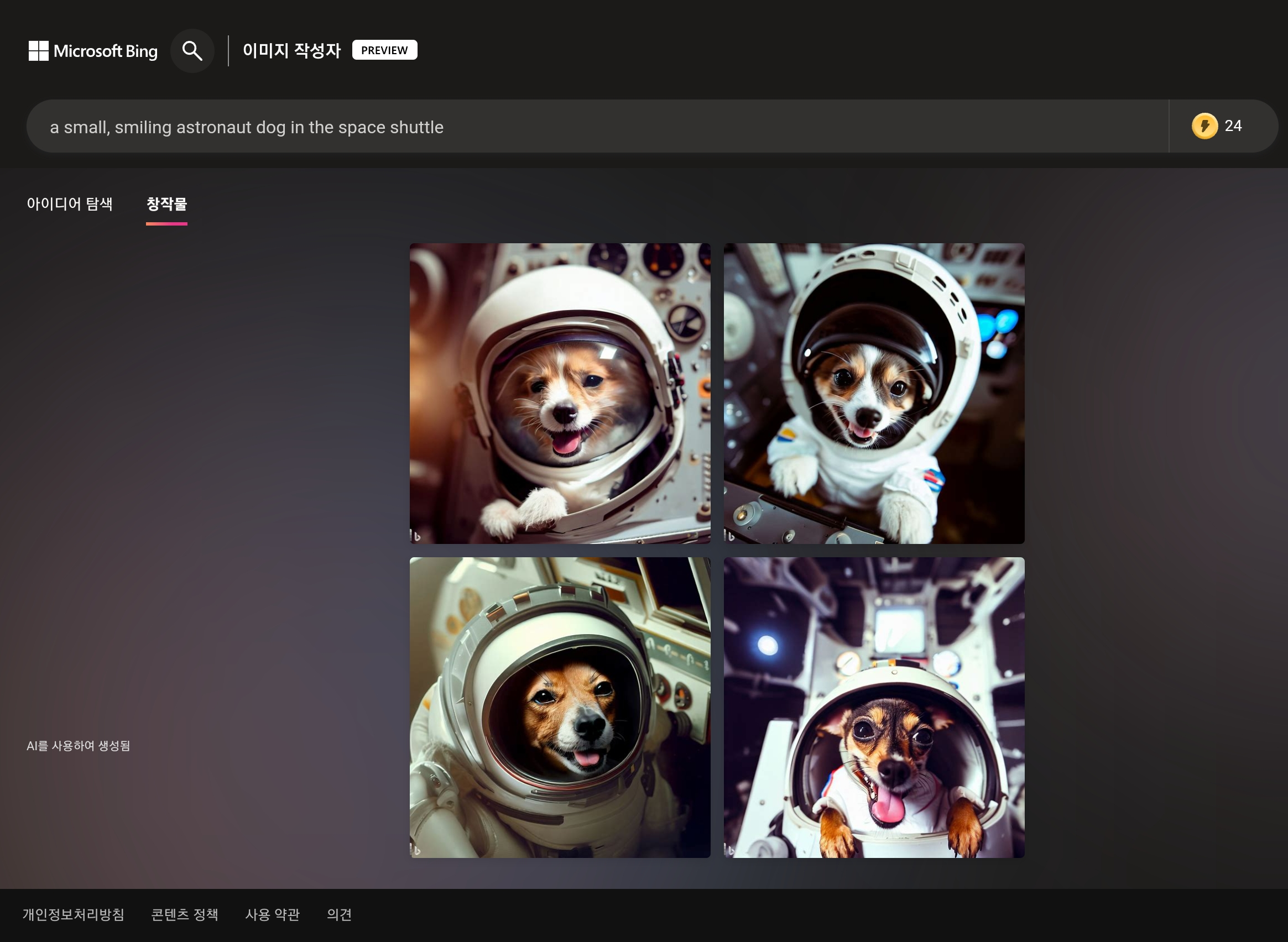 우주선에서 웃고 있는 작은 우주비행사 강아지를 만들어 달라고 요청했더니 이렇게 정확하게 알아 듣고 제가 생각하는 이미지들을 만들어 주었습니다 🫢 놀랍지 않나요? 심지어 화질도 1024x1024 해상도로 꽤 좋습니다.