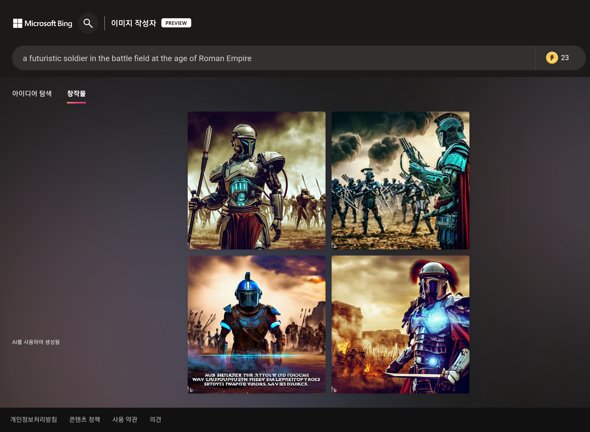 로마 제국 시대 전장의 초현대적인 군인의 모습을 요청한 결과입니다. 이쯤되면 이미지의 무한 창작(?!)도 가능할 것으로 보입니다마치며