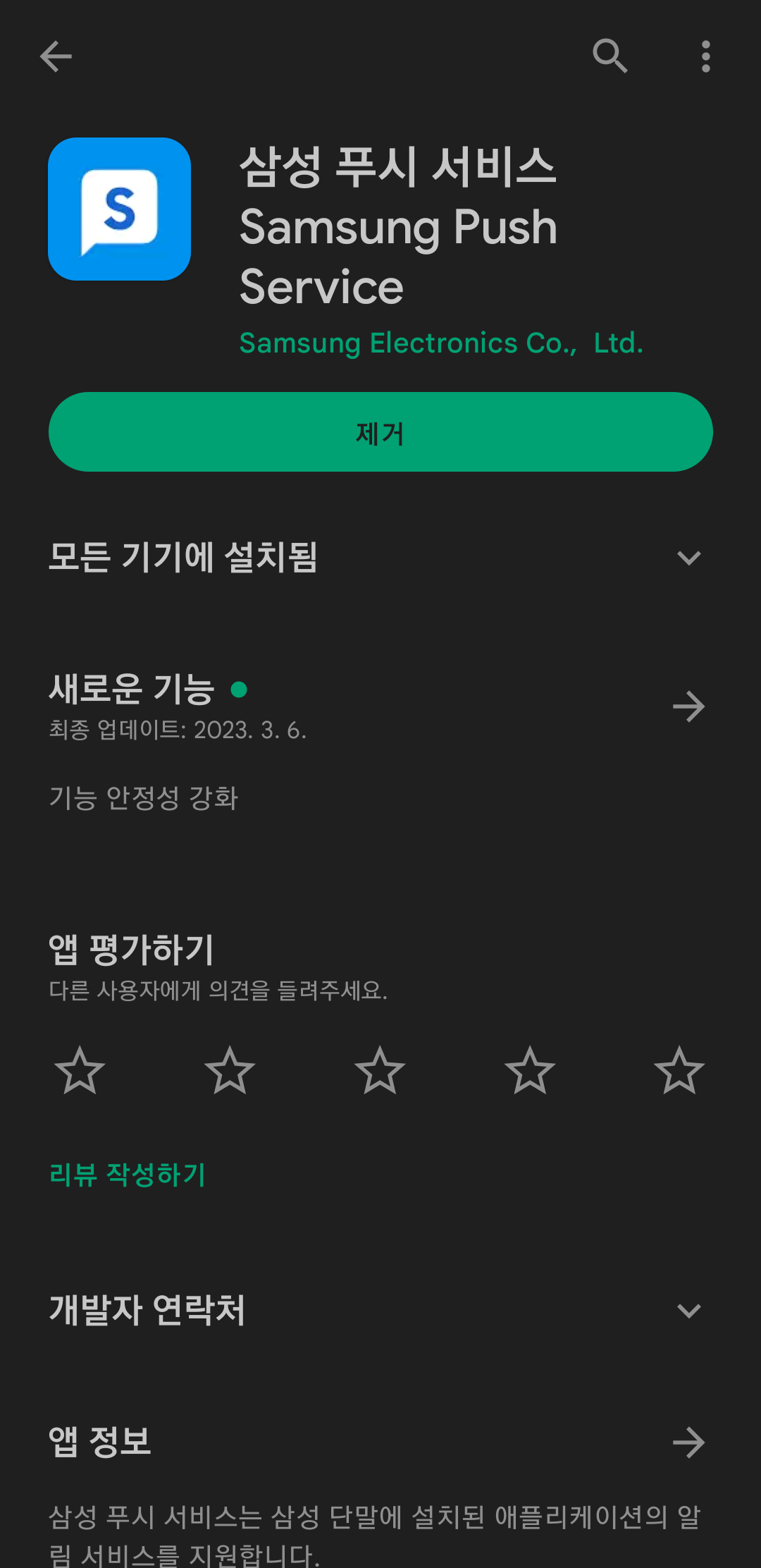 플레이 스토어에 가셔서 '삼성 푸시 서비스'라고 검색해 보시면 위와 같은 앱이 나올텐데, 이걸 '업데이트' 혹은 삭제 후 재설치 하는 겁니다. 그렇게 하신 다음에 재부팅을 하시고, 그래도 동일한 증상이 발생하는지 한번 확인해 보세요.