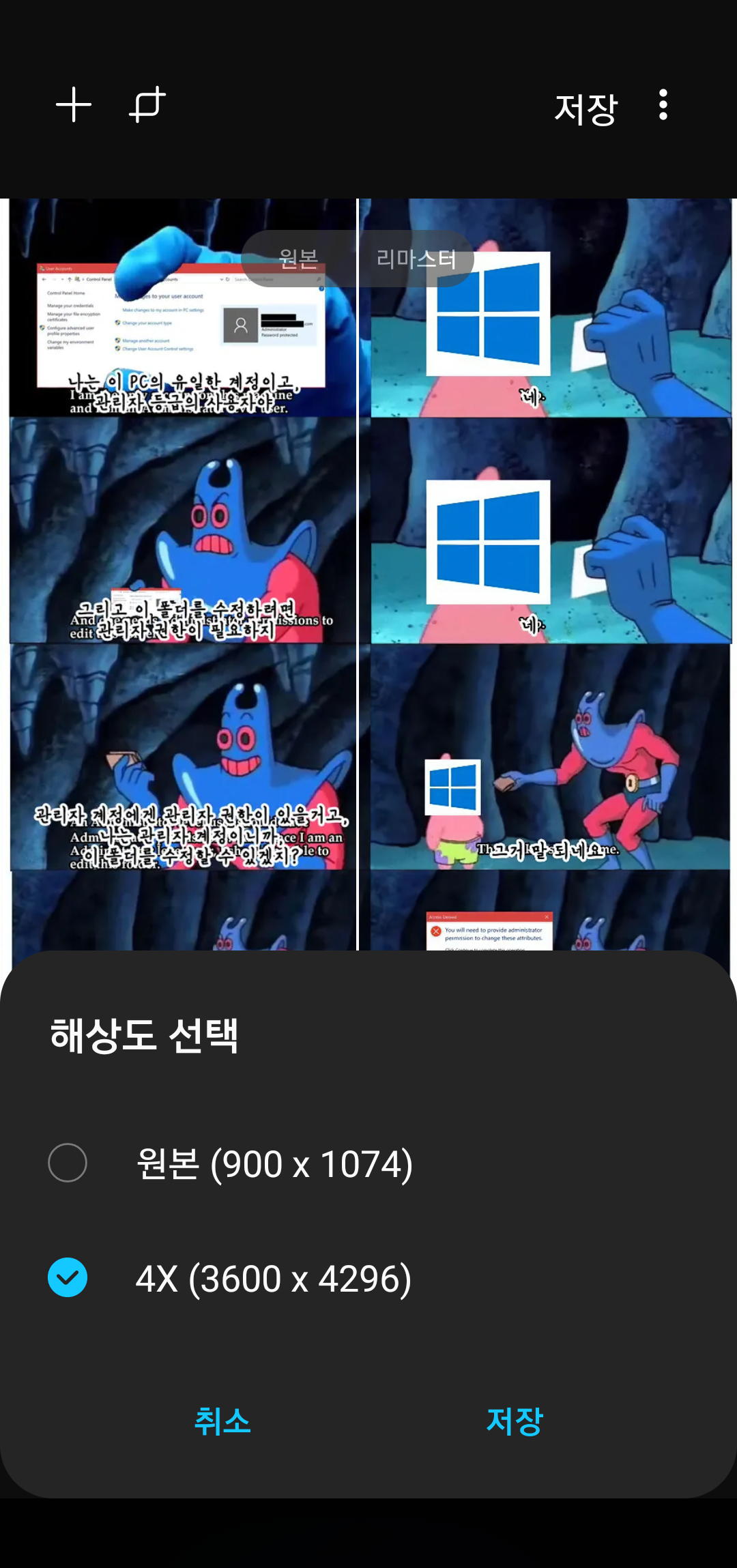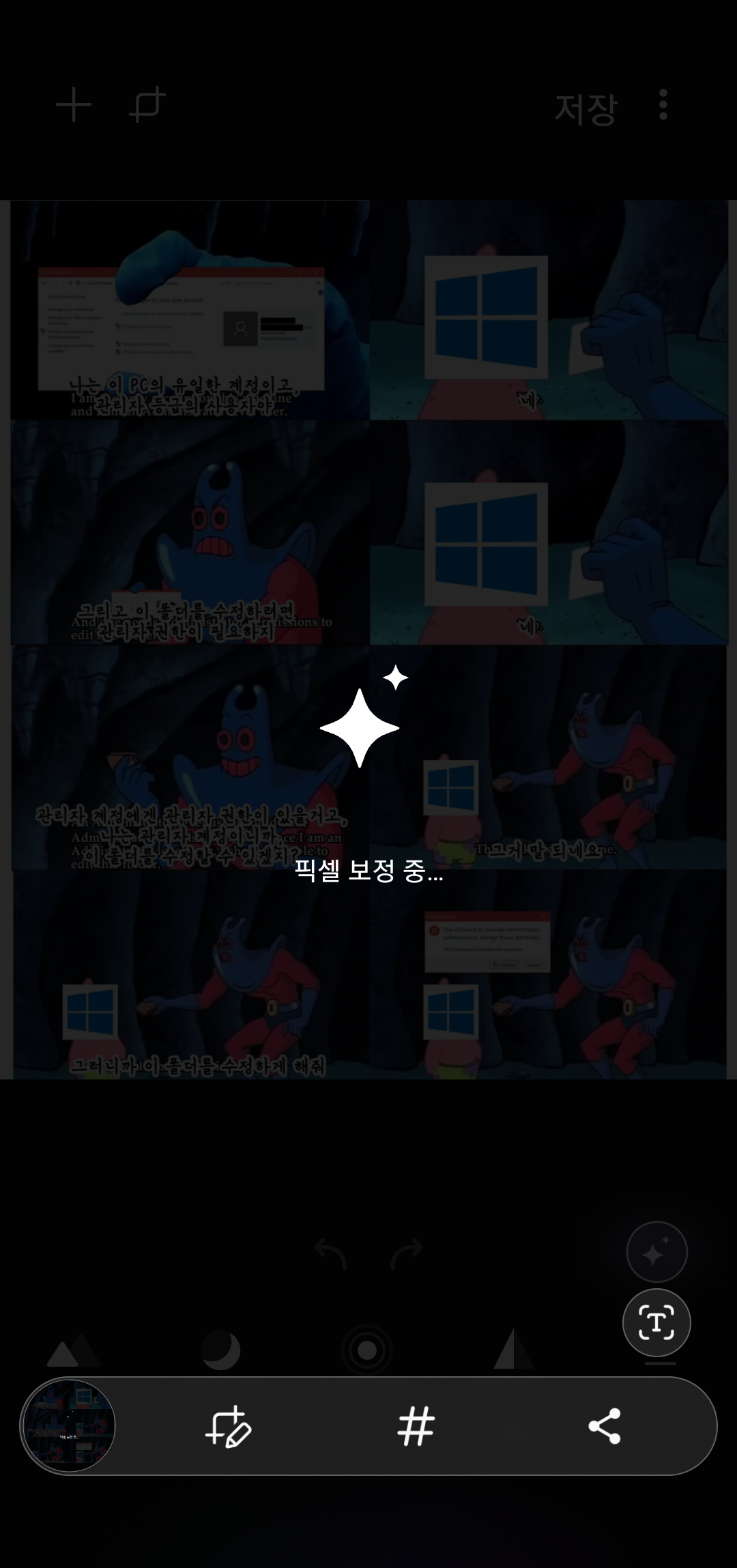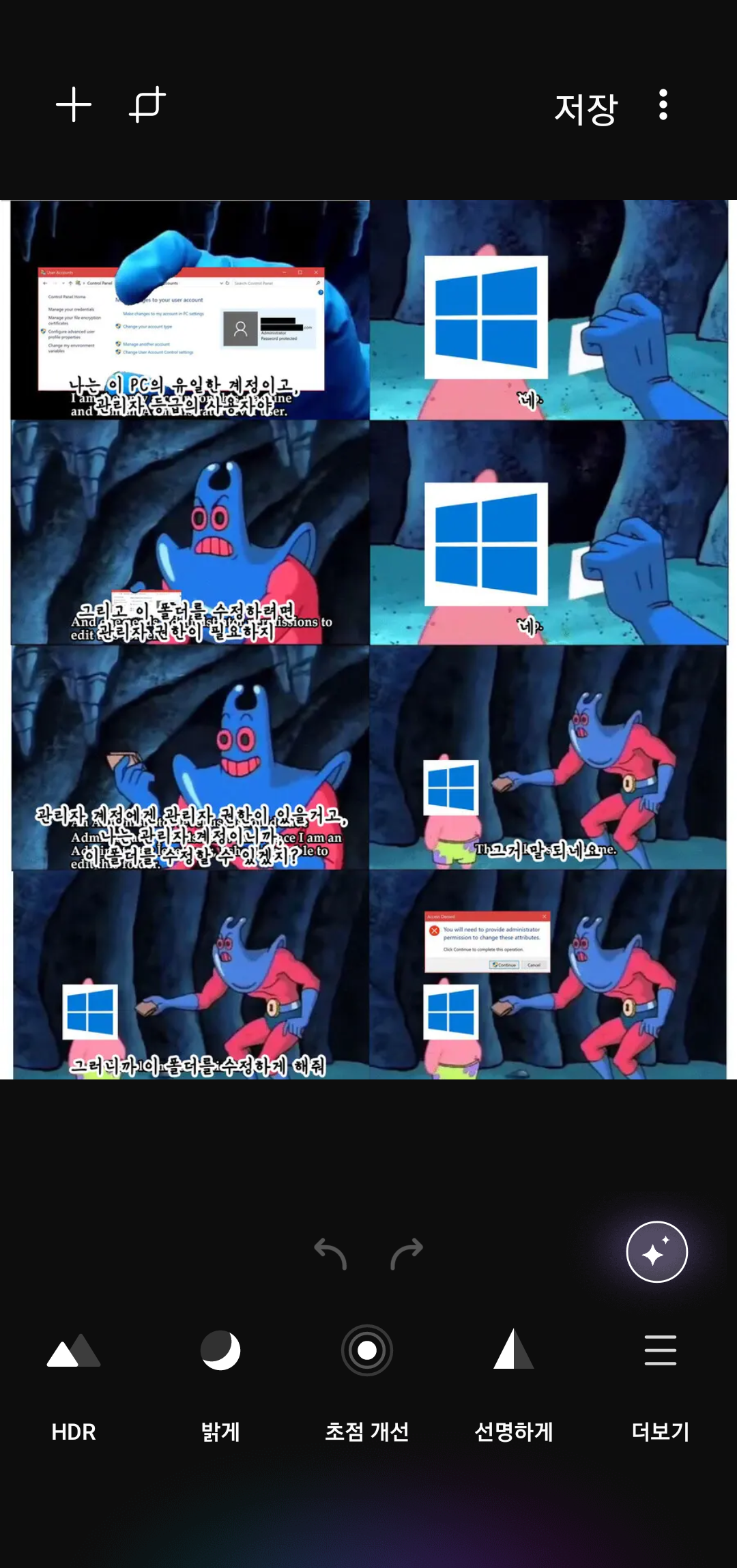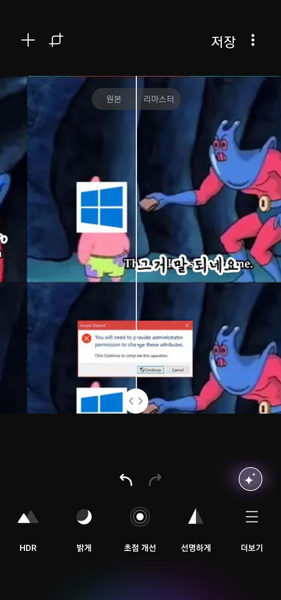 사진을 고르면 HDR 효과 적용, 밝기 개선, 초점 개선, 선명도 개선 등의 옵션이 있고, 그 중에서 별을 터치하면 자동으로 알아서 최적의 결과물을 만들어 주기도 합니다. 저는 요걸 눌러봤습니다. 그랬더니 저화질 짤이 상당히 선명하게 리마스터 되면서 최적화가 한번 더 이루어지네요.