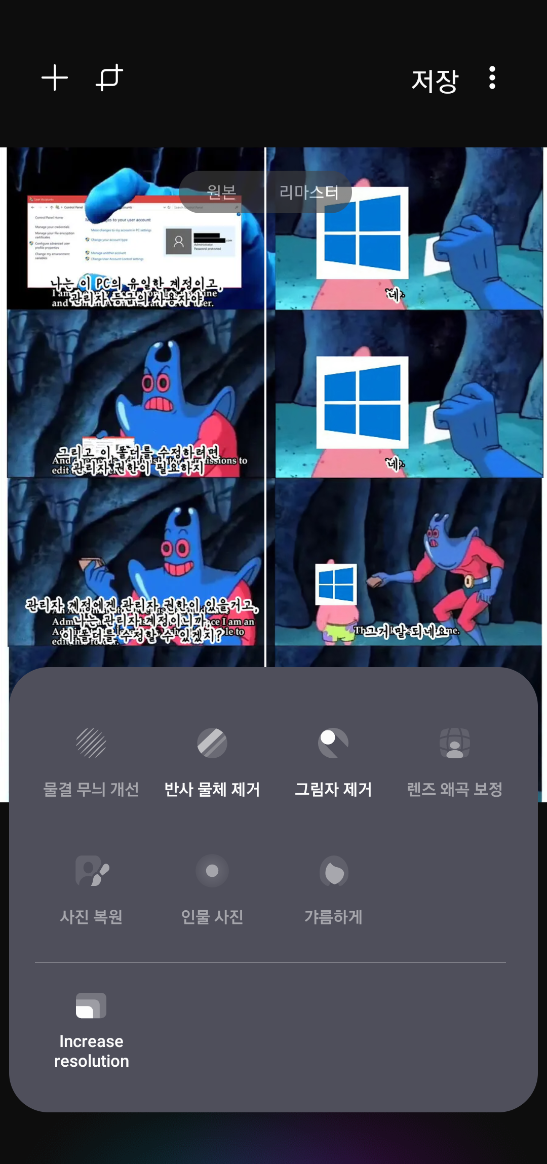 그리고 三더보기를 눌러보시면 물결 무늬 개선, 반사 물체 제거, 그림자 제거 등의 추가 기능들이 나오고 여기에서 해상도 키우기 (Increase Resolution)을 선택하면 저해상도 사진을 최대 4배까지 고해상도로 바꿀 수 있습니다 😯
