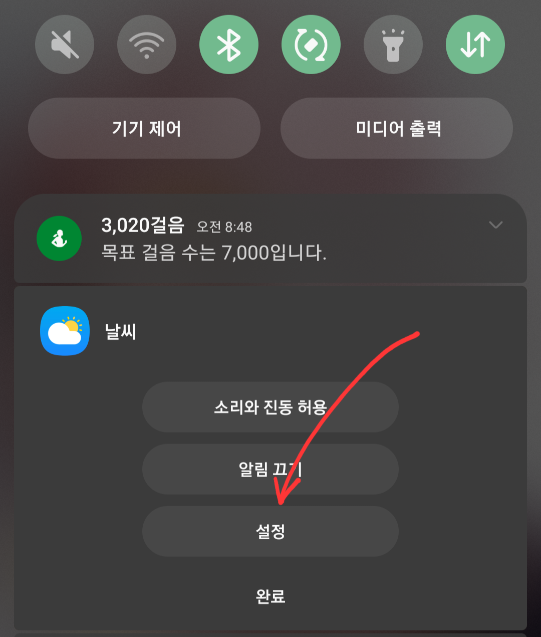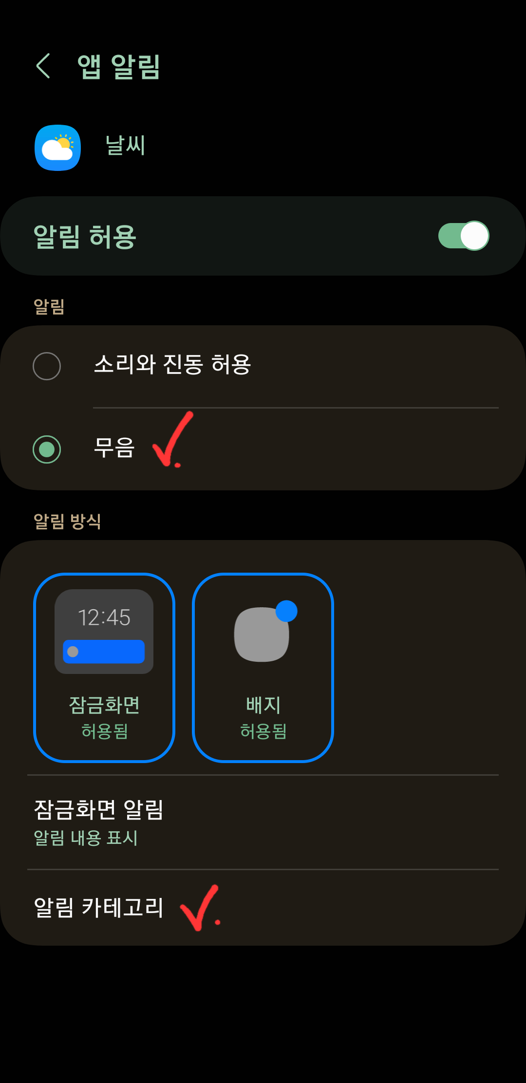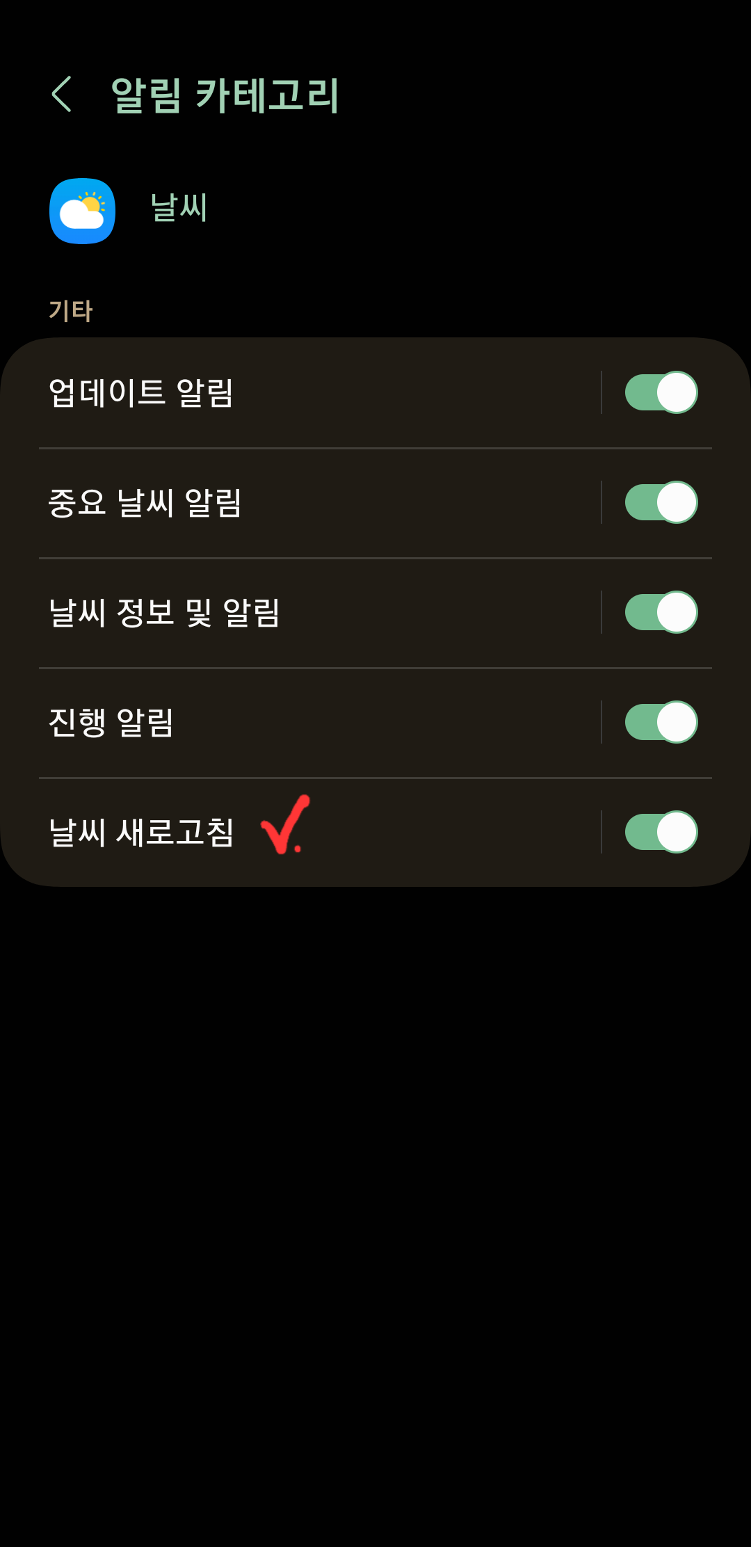 이제 여기에서 날씨 앱 자체의 알림을 그냥 전체 다 무음처리를 해버리거나, 혹은 알림 카테고리 부분에서 [날씨 새로고침] 부분을 꺼주시면, 불필요하게 알림이 울리는 일이 사라집니다.