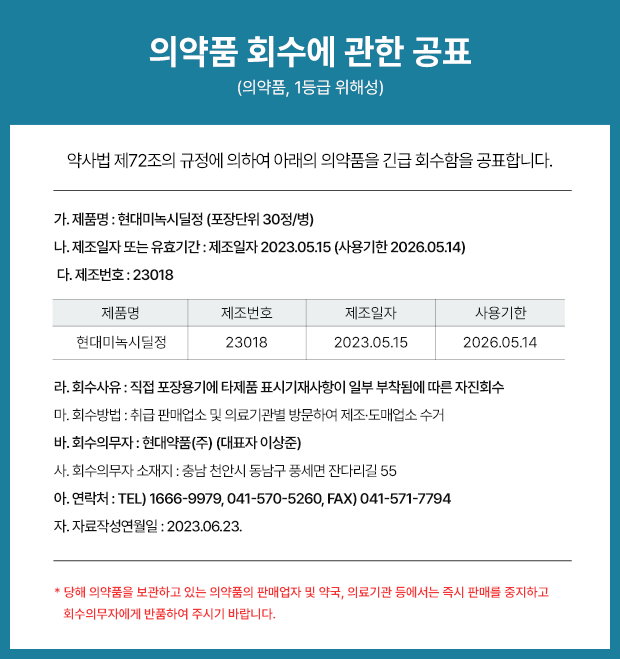 일단 제조사인 현대약품에서는 잘못 나간 약을 복용한 소비자는 없는 것으로 보고 있다고 합니다만, 그래도 혹시라도 위의 조건에 해당하는 제품을 보유하고 계신 분들은 하루속히 반품하시고 후속 조치를 받으시기 바랍니다.
