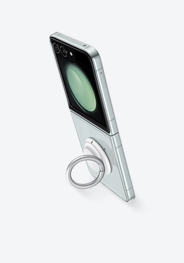 첫 번째는 클리어 가젯 케이스입니다. 기존의 핸드폰에 씌우는 클리어 케이스와 같은 개념으로 투명한 케이스가 제품을 보호해 주는 형태인데, 후면부에는 저렇게 링이 달려 있어서 저걸 세우면 플립을 세로로 혹은 가로로 세우거나 눕혀서 쓸 수 있습니다. 또, 해당 링 부분 자체를 눌러서 돌리면 빼낼 수도 있는데, 여러 디자인의 호환 링으로 바꿀 수도 있습니다.
