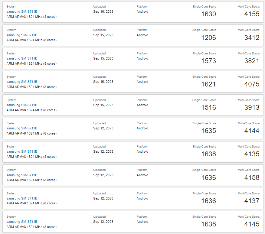 S23FE 제품에 대한 긱벤치 결과들이 속속들이 유출되고 있습니다. 여기서 볼 수 있는 건 싱글코어 점수가 대략 1600점대로 거의 일정하게 나오고 있다는 점과 멀티코어 점수는 4100점대를 기록하고 있다는 사실입니다.