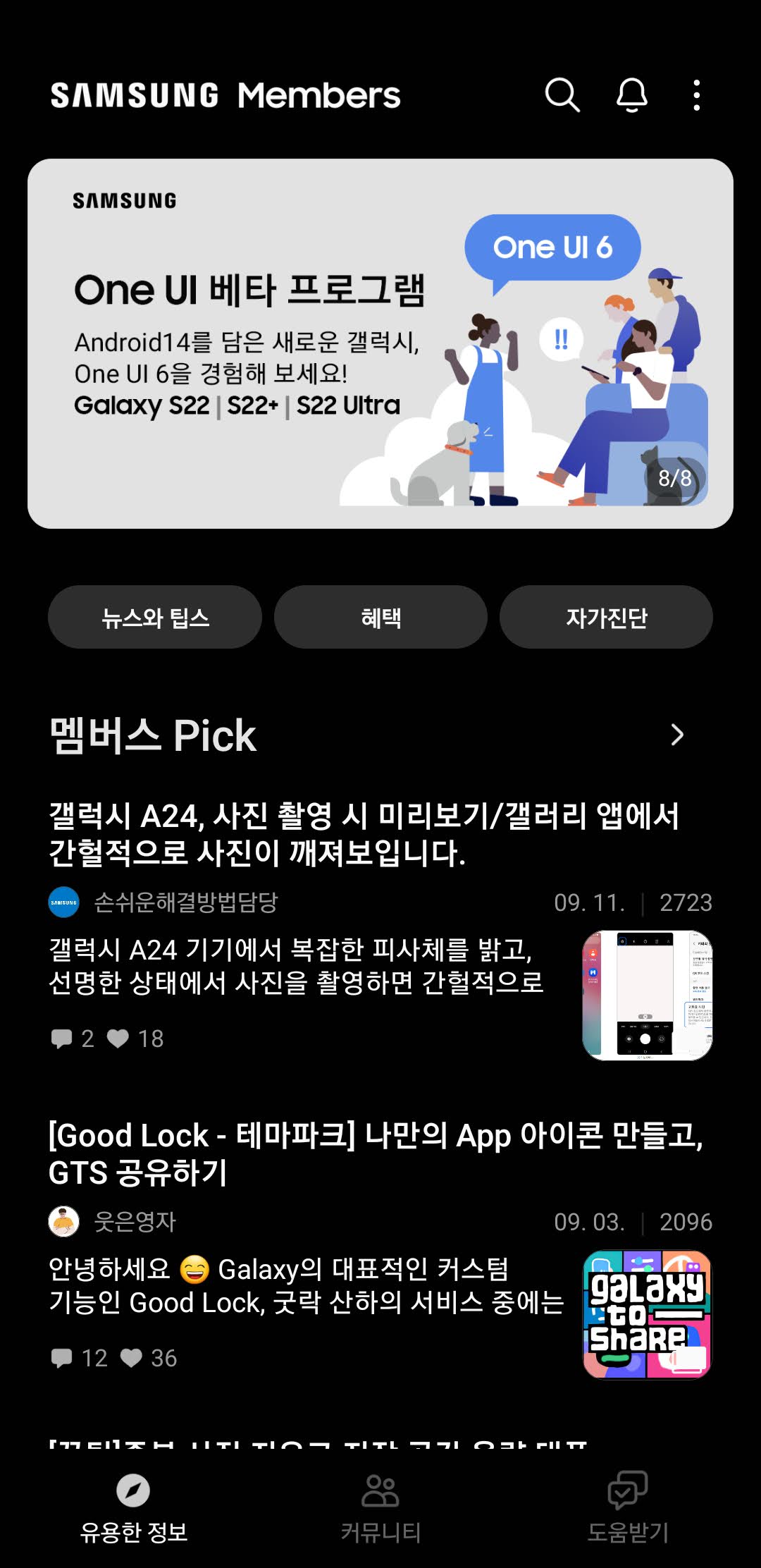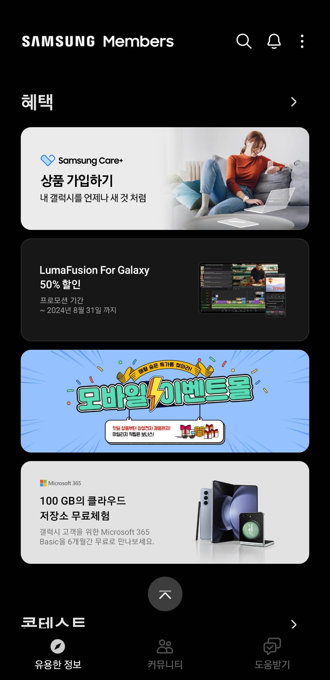 모든 갤럭시 스마트폰에는 '삼성 멤버스' 라는 앱이 존재합니다. 영어로 Samsung Members라고 되어 있어요. 이걸 들어가서 보면 위와 같은 화면을 보게 되는데, 아래로 내려가보면 [혜택] 이라는 분류 하에 여러가지 배너가 보입니다.