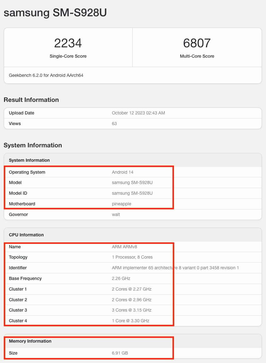 그리고 S24 시리즈에서는 '울트라' 모델에는 스냅드래곤 8 Gen 3가 들어가고, 일반형과 플러스 모델에는 엑시노스 2400을 쓴다는 루머가 한창 나돌고 있습니다. 이걸 입증이라도 하듯, S24 울트라 제품의 긱벤치 결과도 속속들이 드러나고 있는데, 다음과 같습니다.