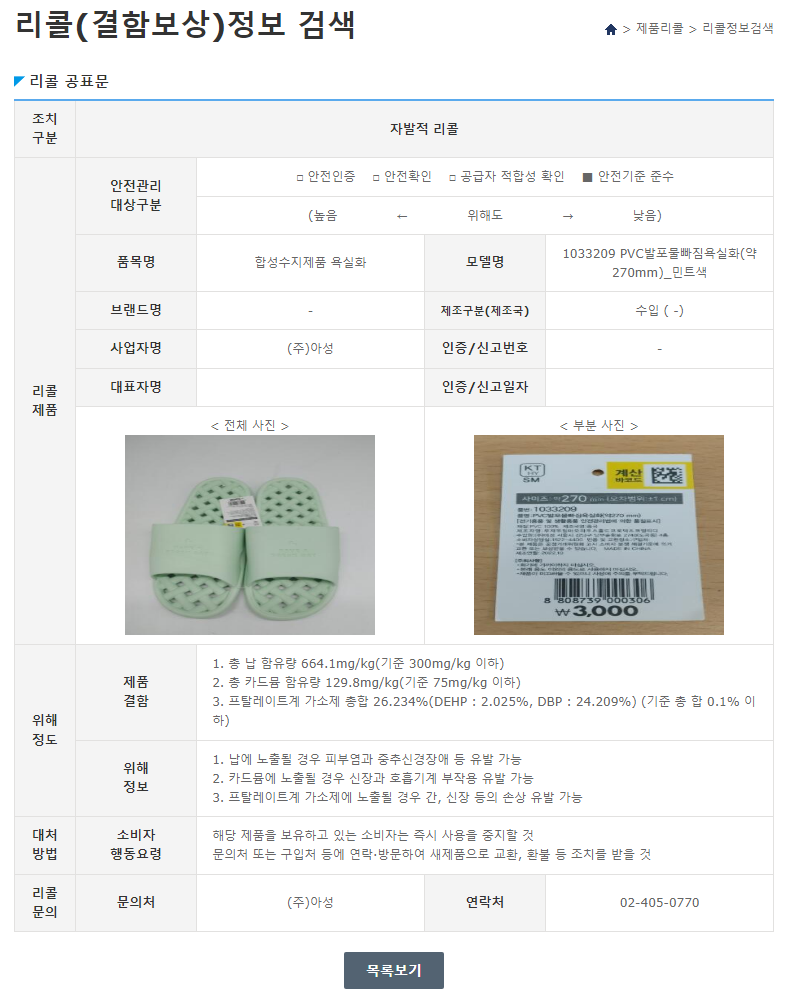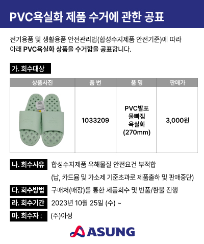 다이소에서 판매중인 욕실 슬리퍼 제품 중 하나가 안전성 문제로 자발적 리콜에 들어간다고 합니다. 3천원짜리 제품이고 "PVC 발포 물빠짐 욕실화" 입니다. 그 가운데 민트색 270mm 사이즈 제품이라고 하는데, 현재까지 무려 5만3천여 켤레가 판매 되었다고 합니다.