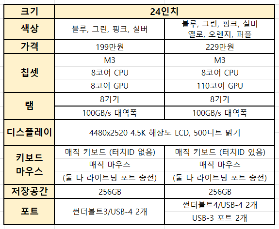 이번 아이맥은 칩셋이 M3로 바뀌었다는 것 외에 달라진 점을 찾아보기가 매우 힘듭니다. 램도 기본 8기가 구성이고, 200만원짜리 기본형에는 여전히 터치 아이디도 없는 키보드 제공, C 타입 포트도 2개 뿐이거든요. 또 디자인 상으로도 전혀 차이가 없어서, 말 그대로 칩셋 변경 외에는 사실상 변경점을 찾아보기가 불가능합니다. 그리고 명색이 데스크탑인데 저장공간도 여전히 256GB 밖에 되지 않는다는 건 참 .....