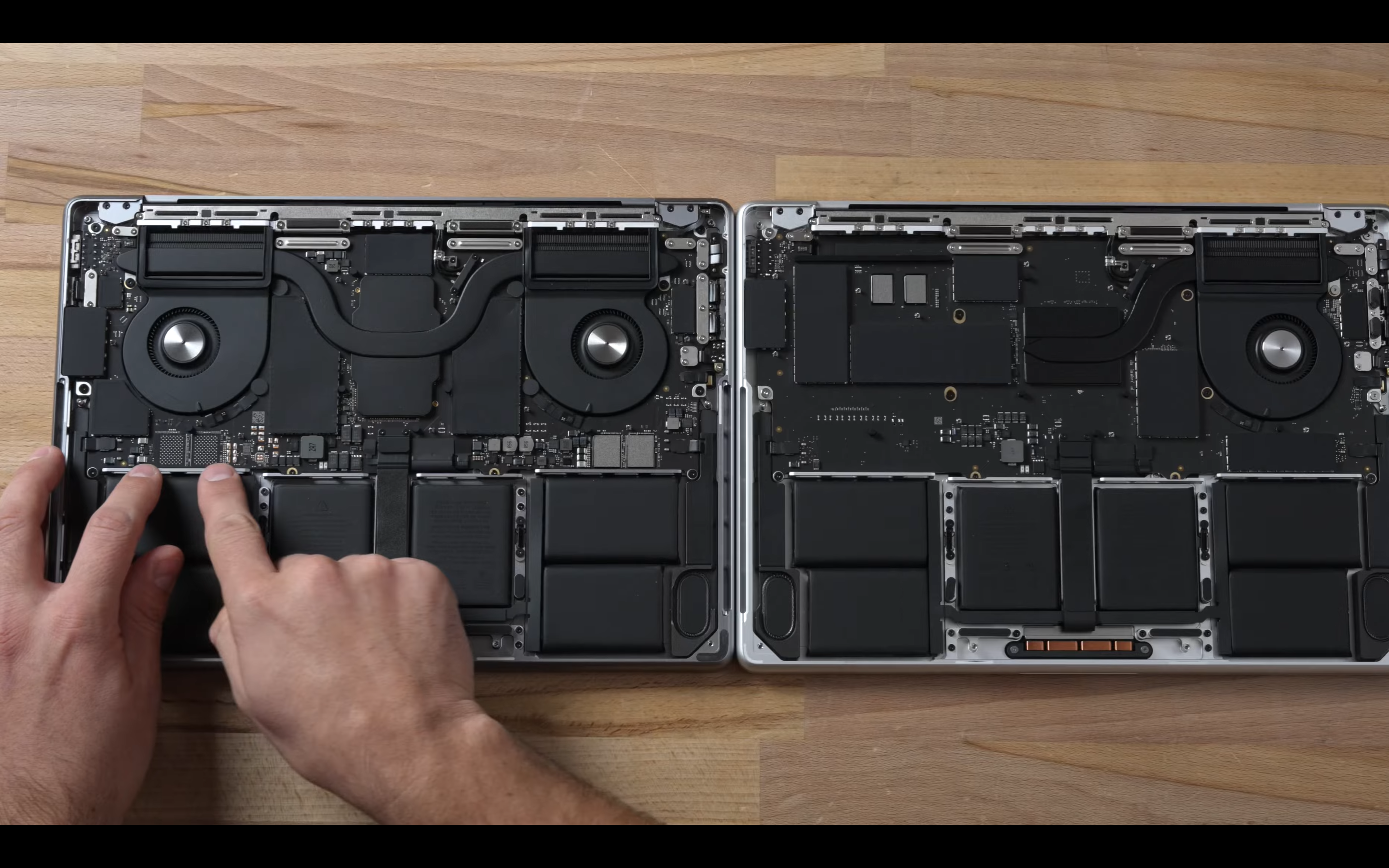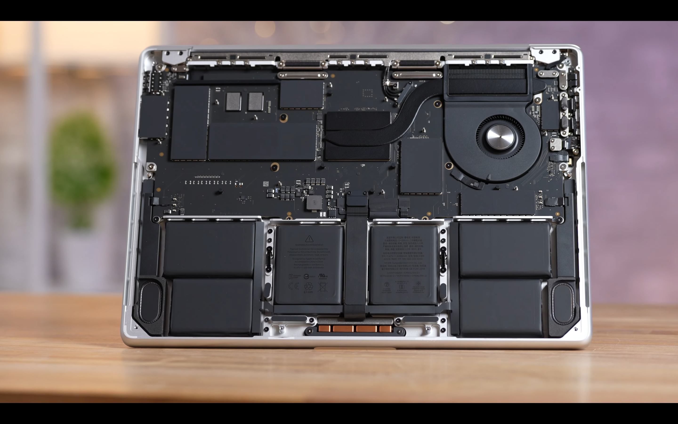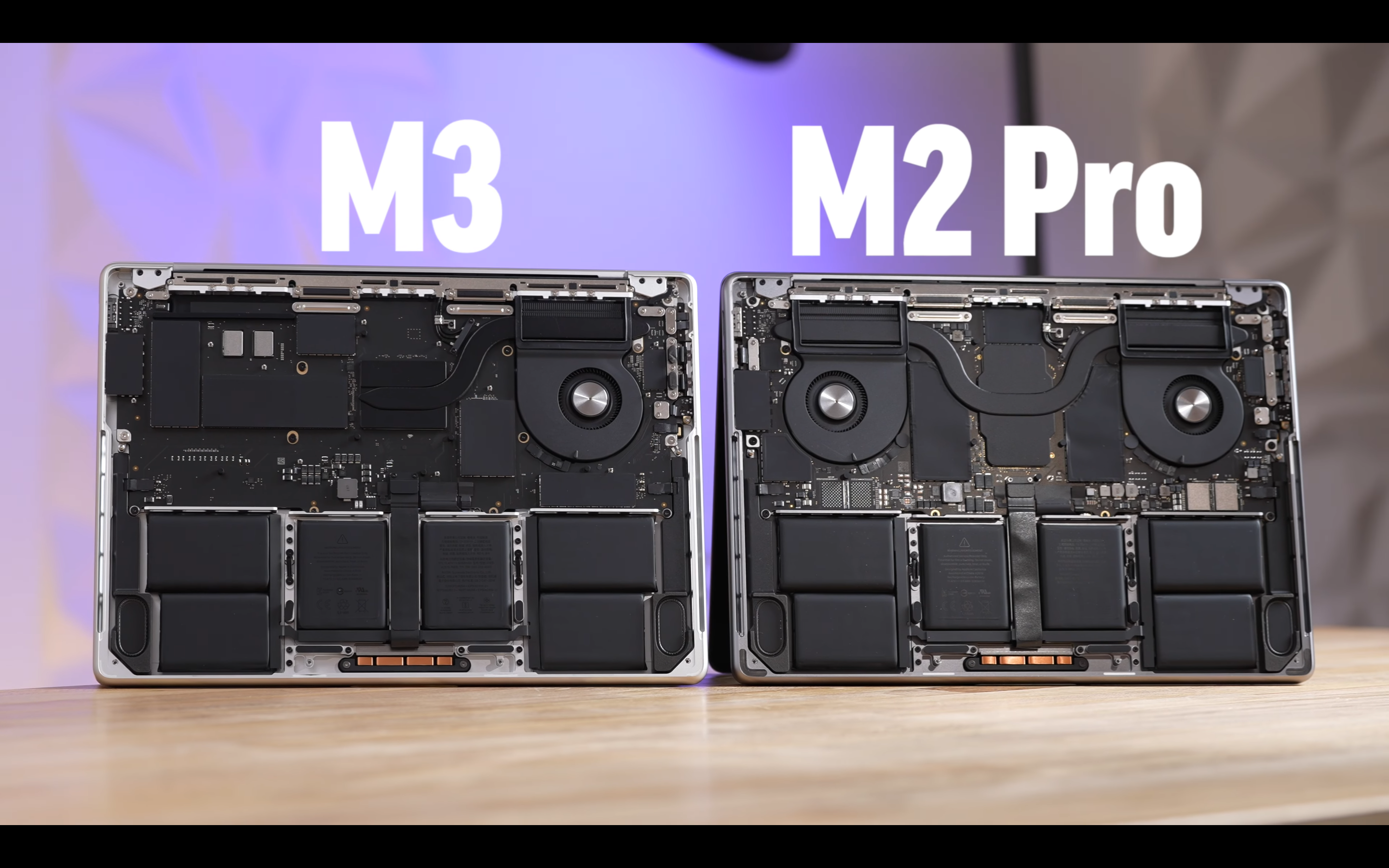 제품 내부를 살펴보면 일단 가장 먼저 눈에 띄는게 하나 있죠. 바로 팬과 히트 싱크입니다. 이번 기본형 M3 맥북 프로는 팬이 하나 뿐이고, 히트 싱크도 더 작습니다.