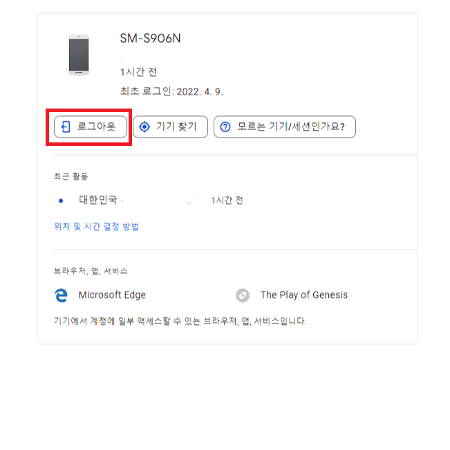 그러면 기존에 사용하던 기기가 기록에 남아 있는 걸 알 수 있는데, 해당 기기에서 '로그아웃'처리를 해주시면 됩니다. 이렇게 하면 완벽하게 전부 다 끝나는 겁니다.
