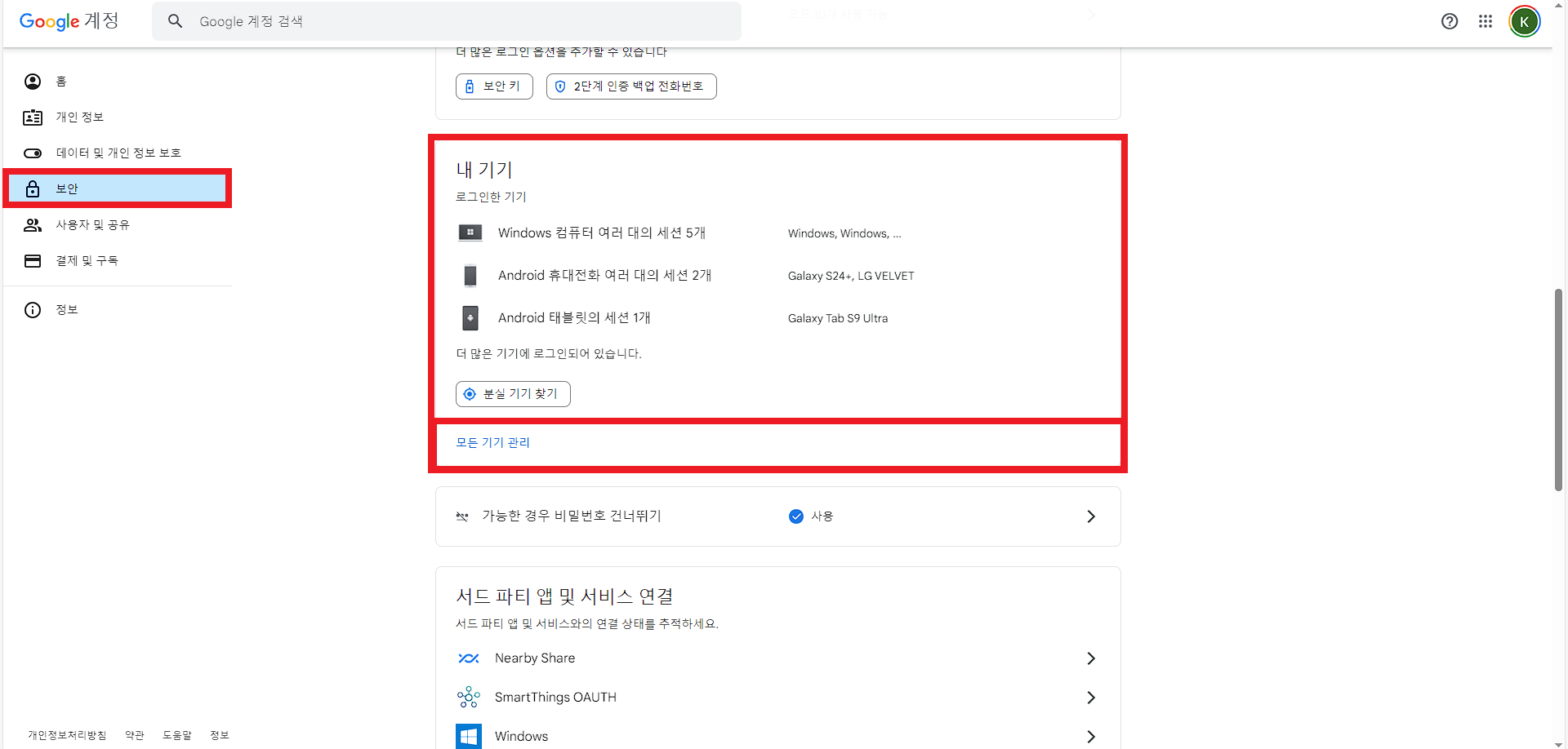 account.google.com 으로 가보면 왼쪽에 '보안'이라는 탭이 있는데, 여기를 누른 다음 '내 기기' 부분에서 하단의 '모든 기기 관리'를 누릅니다.