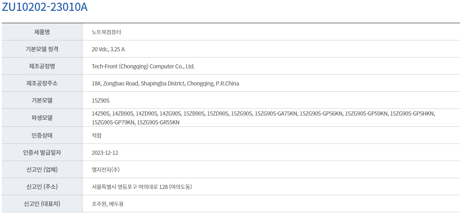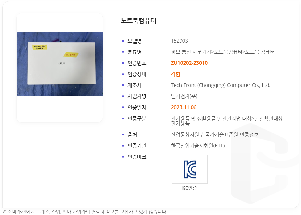 한국산업기술시험원에서 조회를 해보면, 15Z90S라는 15인치 그램 모델을 대표로하여