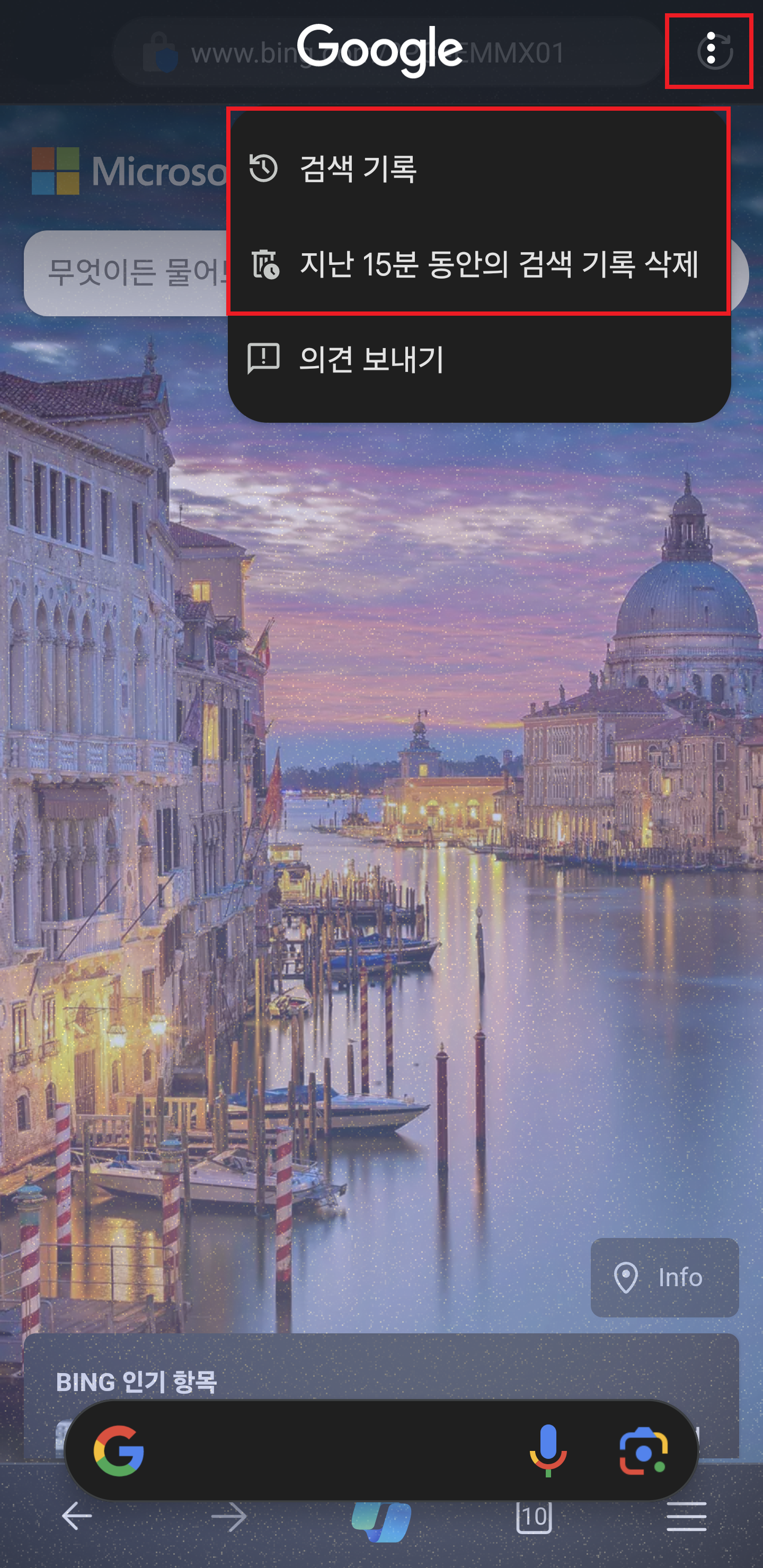 그러면 오른쪽 상단의 점 3개를 터치, 검색 기록 으로 들어갑니다. 여기에서 개별적인 검색 기록을 지울 수도 있고, '자동 삭제' 기능을 이용해서 일정한 주기로 알아서 기록이 삭제되도록 할 수도 있습니다.