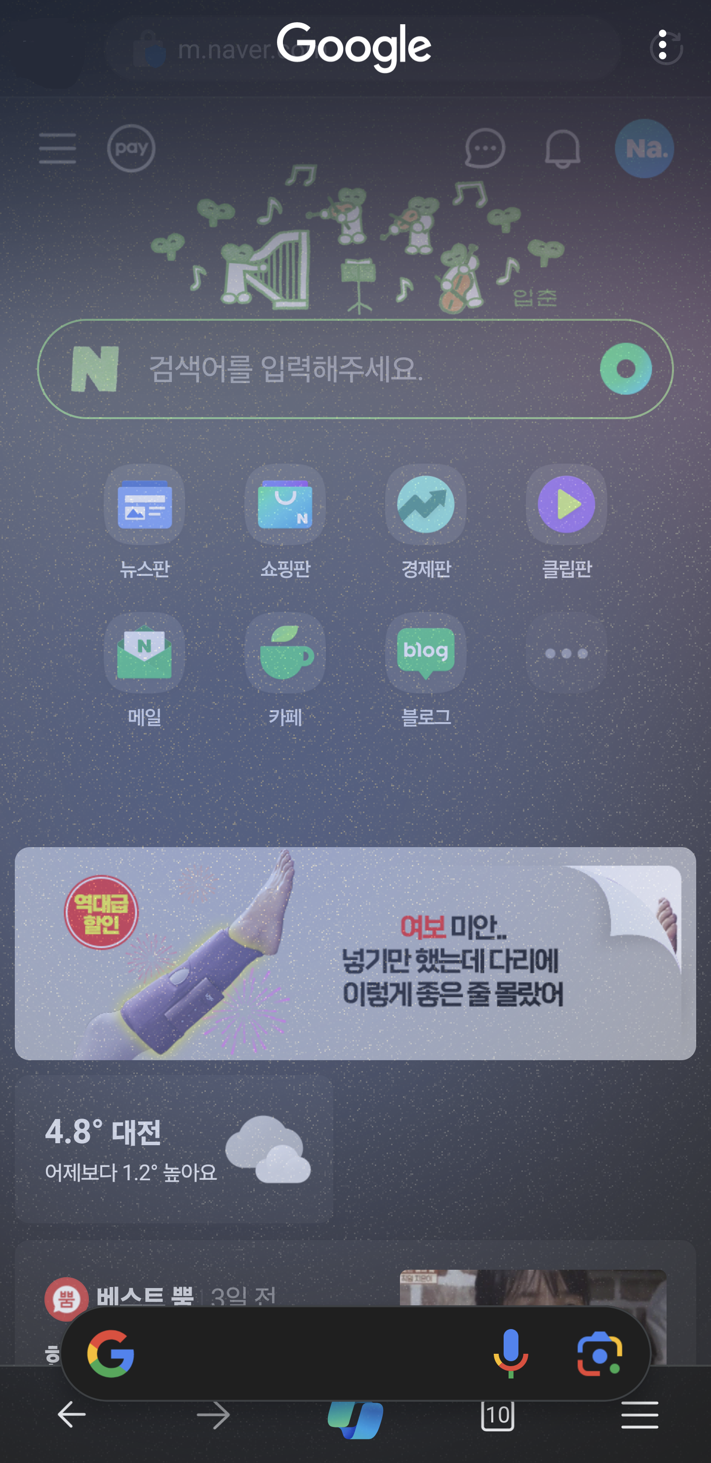 예를 들어 이렇게 네이버를 들어갔다고 쳤을 때, 스크린샷에는 내비게이션 바가 보이지 않지만, 실제로 저 빨간색 화살표 부분에 바가 있잖아요? 거기를 꾸욱 누르고 있으면 써클 투 써치 기능을 사용하기 위한 준비가 됩니다! 그리고 원하는 부분을 동그라미, 네모, 세모 혹은 연필로 지우듯 막 문질러 보세요. 그럼 바로 검색이 가능해집니다.