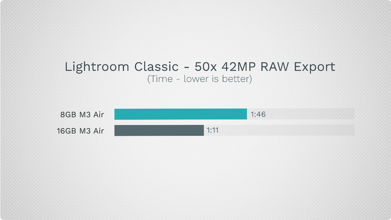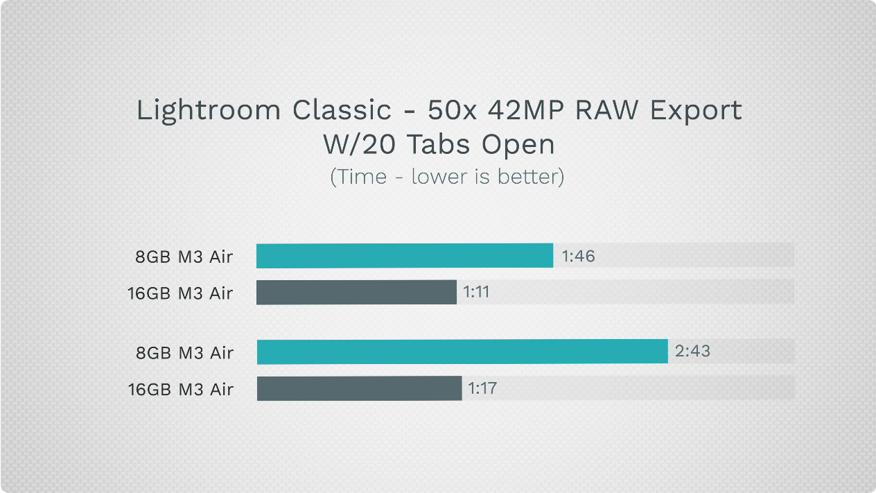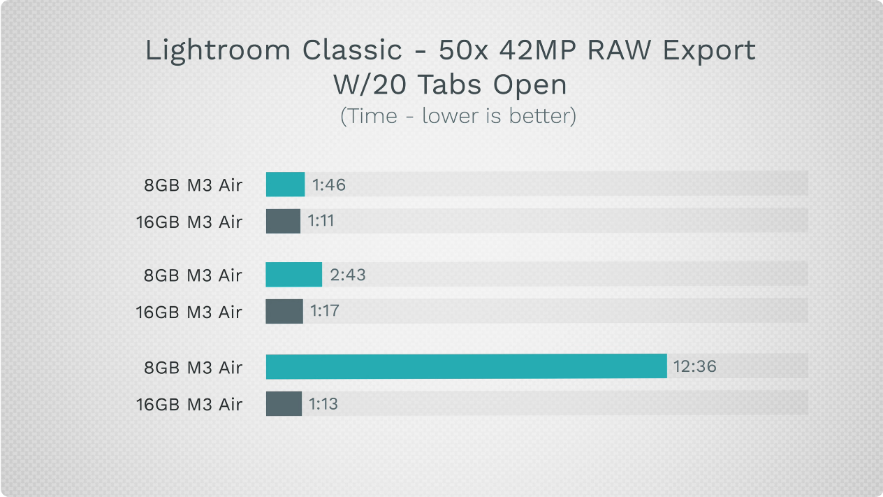 여기에 멀티태스킹 작업을 진행하면서 백그라운드로 라이트룸 내보내기를 진행하면 (맨 아래 그래프) 차이가 더더욱 심각하게 벌어집니다. 이 그래프를 통해, M3 맥북에어를 제대로 쓰려면 16기가가 최소한의 기본 조건이 되어야 한다는 걸 알 수 있습니다. 8기가 제품은 실사용 자체가 매우 힘든, 사는 순간 무조건 호구되는 제품인 겁니다.