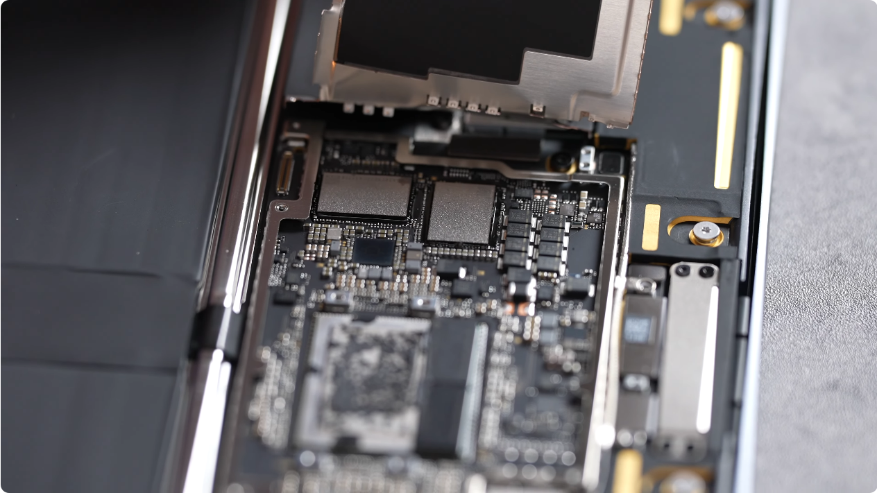 2개의 낸드칩으로 구성된 M3 맥북 에어 내부 모습. 출처: Max Tech
