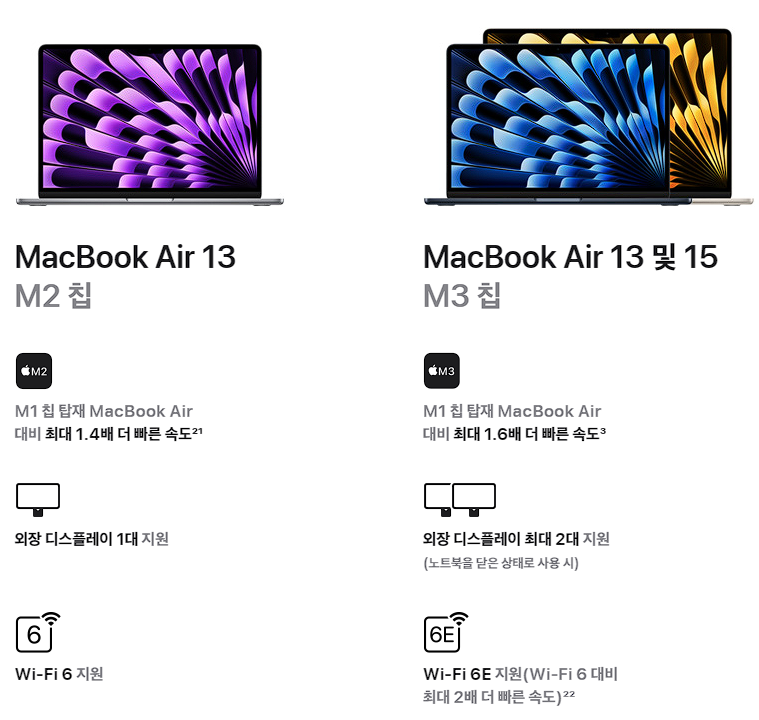 근데 비교샷에서 뭔가 눈치를 채셨나요? 맥북에어 M2 모델은 13인치만 나와있죠? 네, 15인치 M2 맥북에어는 단종입니다. 이제 15인치 제품은 M3 로만 나온다는 이야기입니다.