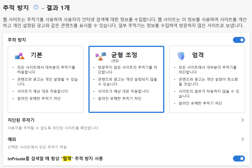 엣지의 설정으로 가셔서 왼쪽 상단의 검색창에 '엄격' 이라고 넣어보세요. 그러면 아래와 같은 화면을 보시게 됩니다.