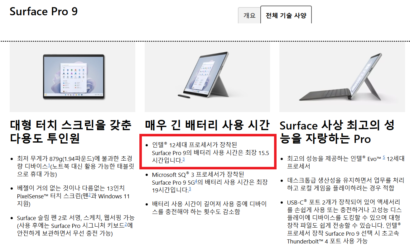 그 대표적인 사례가 바로 서피스 프로9인데요, 스펙상으로는 최대 15.5시간을 쓸 수 있다고 되어 있죠? 그런데 저 테스트 조건 가운데 하나가 바로 밝기 150nit 입니다. 근데 서피스 프로9의 최대 밝기는 450nit 거든요? 그러니 밝기를 35%도 안 되게 해놓고 테스트를 한 결과라는 말입니다 ㅎㅎ;