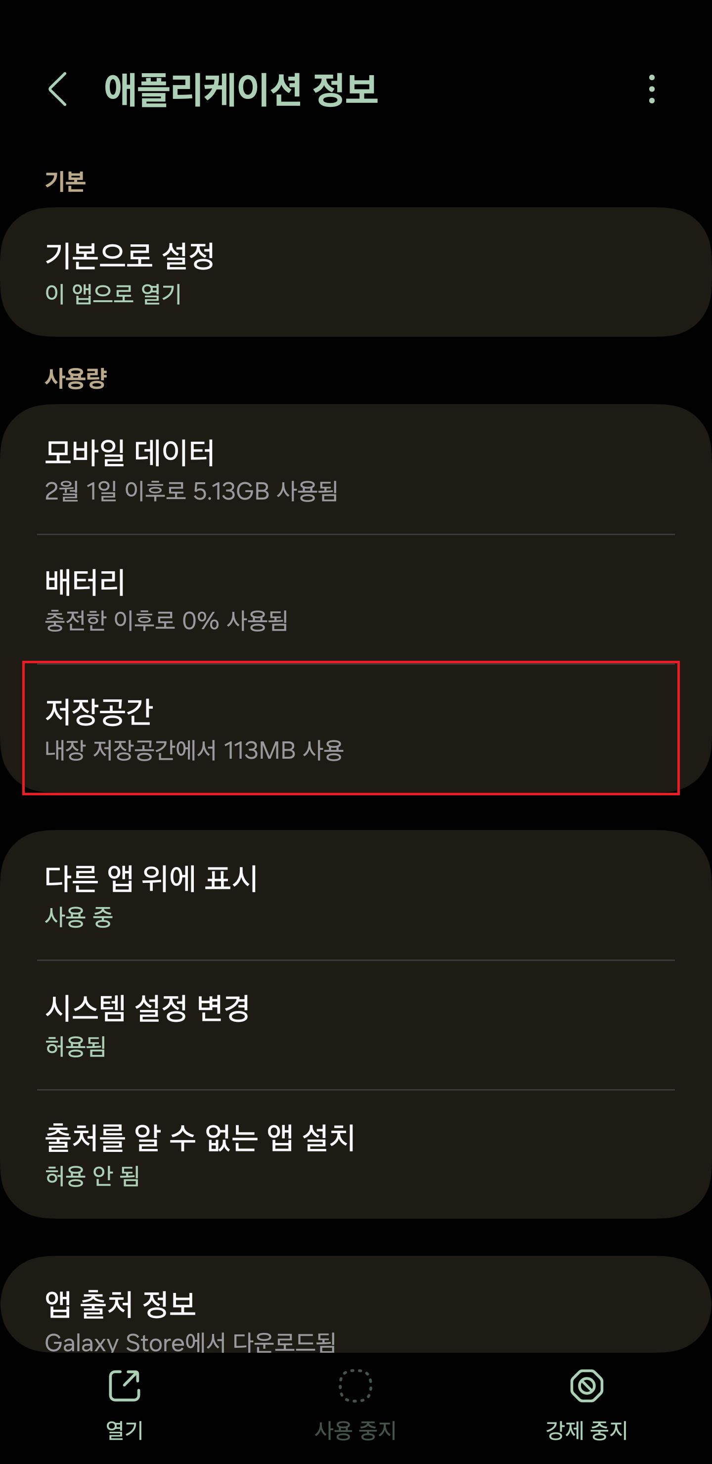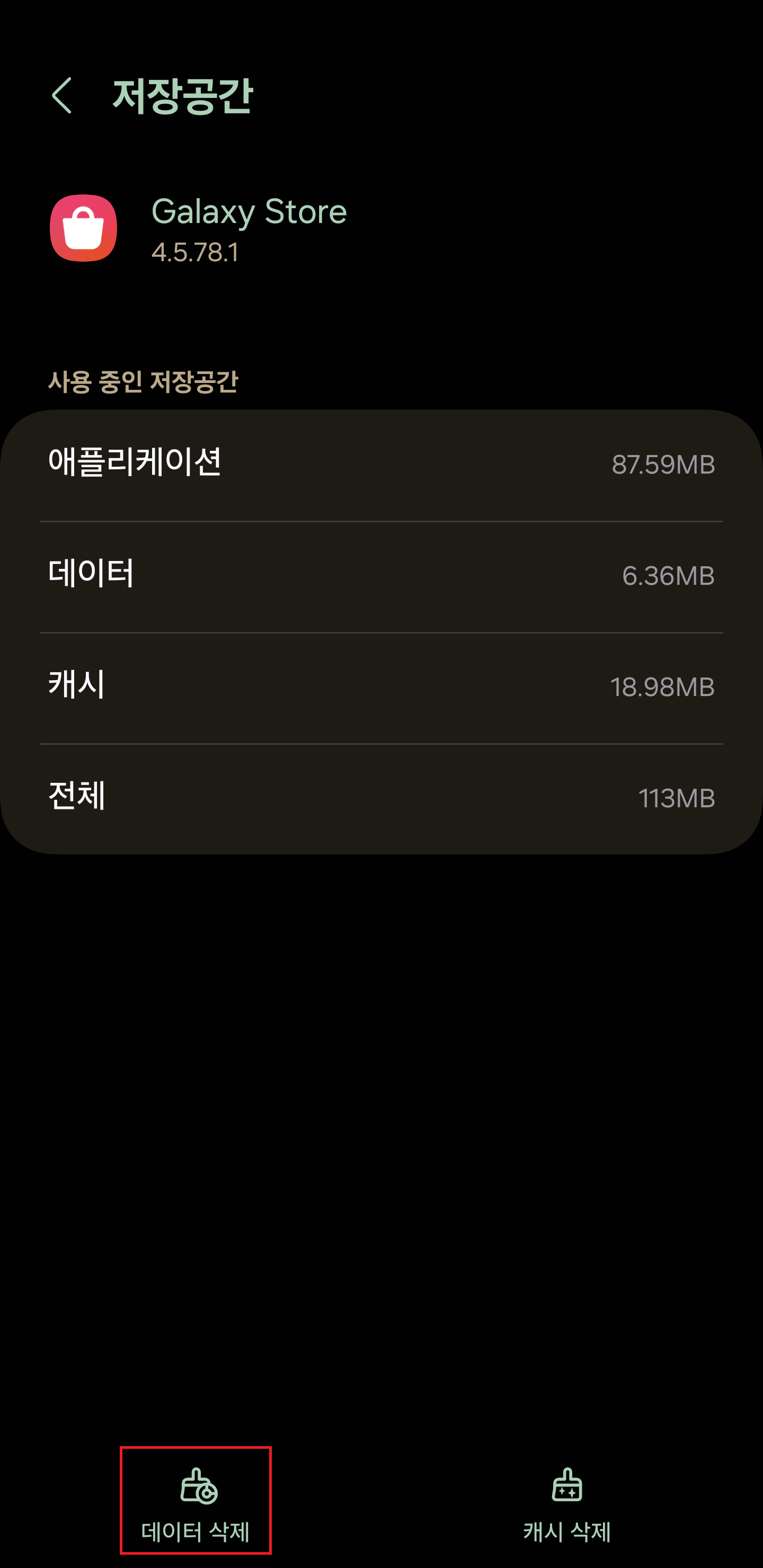 그리고 '저장공간'으로 들어가서 하단의 '데이터 삭제'를 누릅니다. 이렇게 하면 갤럭시 스토어가 초기화 됩니다. 그 후 워치를 한번 껐다가 켠 다음 다시 워치에서 설정 → 애플리케이션 → 삼성 앱 업데이트 로 가서 내장 앱 업데이트를 시도해 보세요.