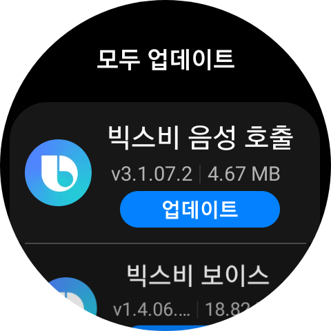 워치 자체에서 설정 → 애플리케이션 → 삼성 앱 업데이트 여기로 가면 갤럭시 스토어가 실행되면서 기본 내장 앱이 업데이트 되죠. 예를 들면 삼성 헬스 모니터라든가 각종 워치페이스 같은 것들이 여기에서 업데이트가 이루어집니다.
