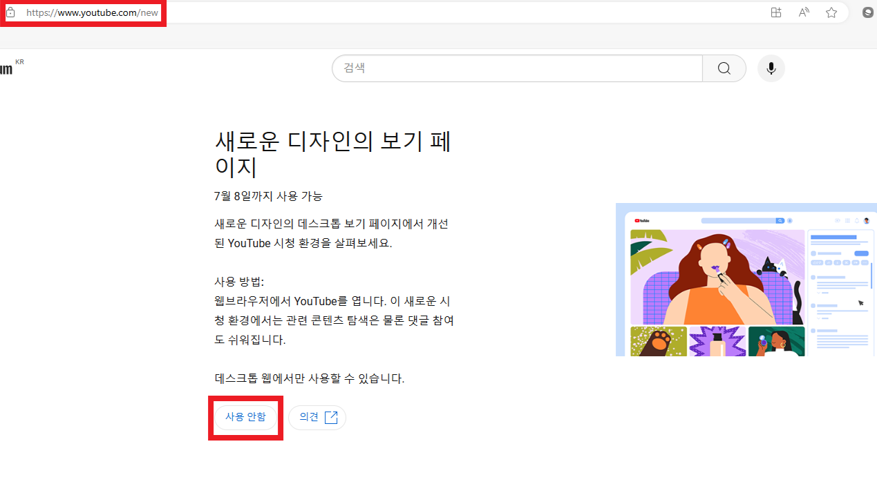 위의 링크를 통해서 유튜브의 '실험실'로 들어갑니다. 그리고 새로운 디자인의 미리보기를 사용 안 함으로 바꿔주시면 됩니다
