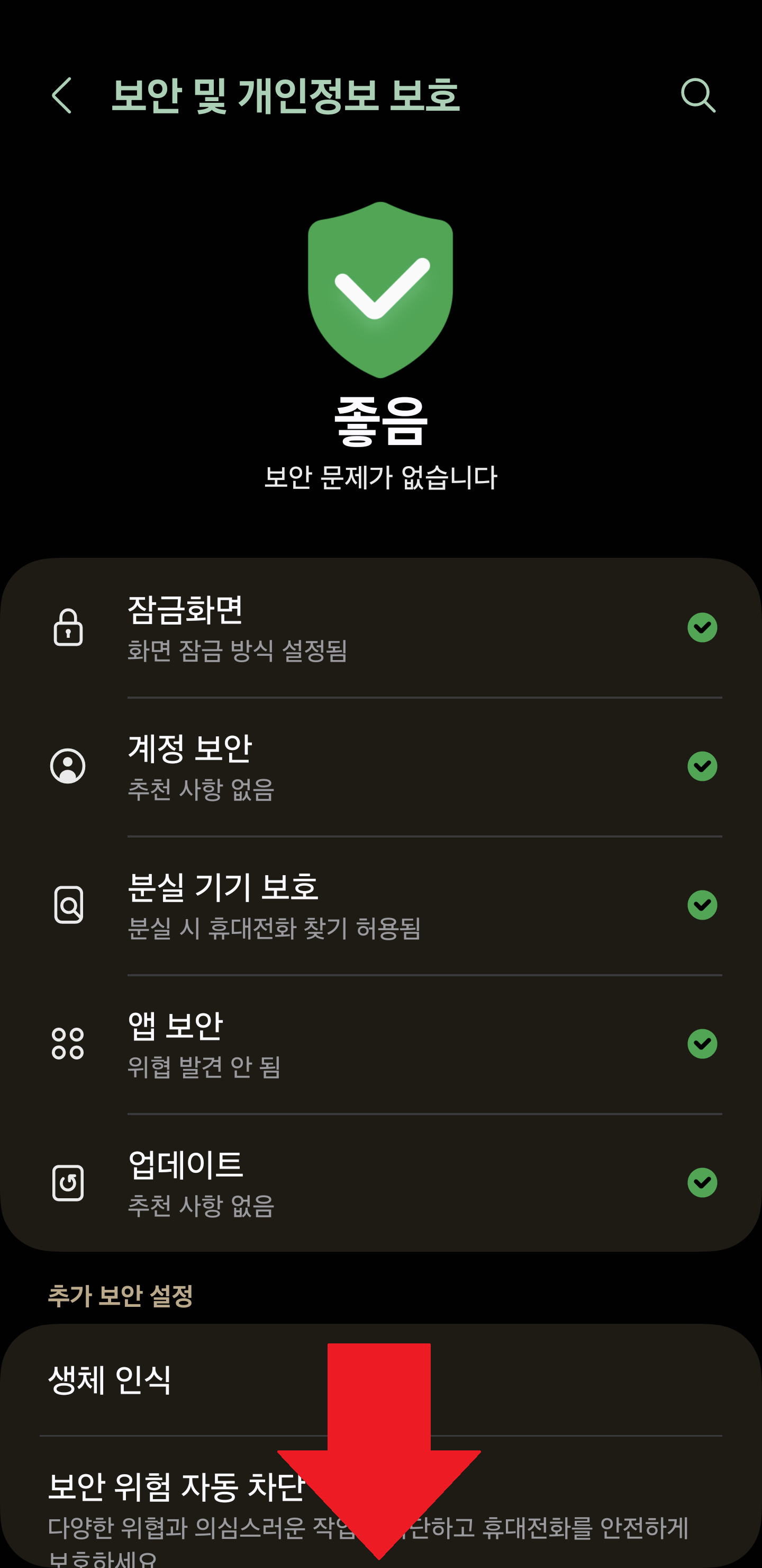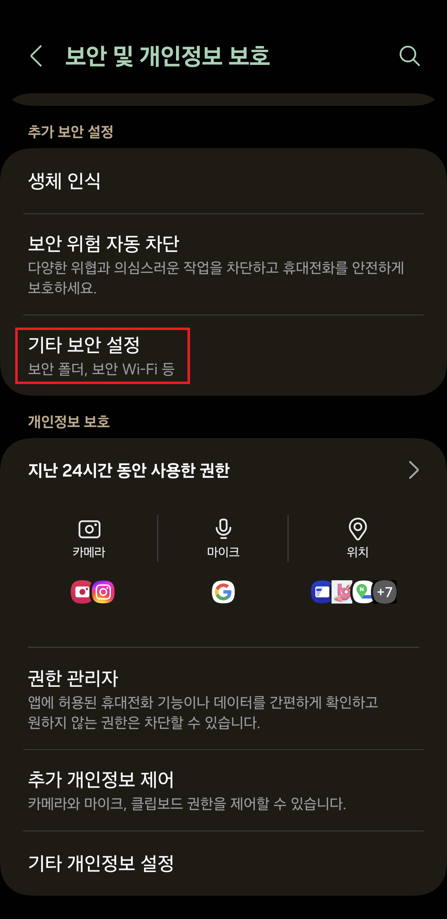 먼저 핸드폰이나 탭에서 설정으로 가신 후에 [보안 및 개인정보 보호] 로 가보시면 아래와 같은 화면을 보시게 됩니다.