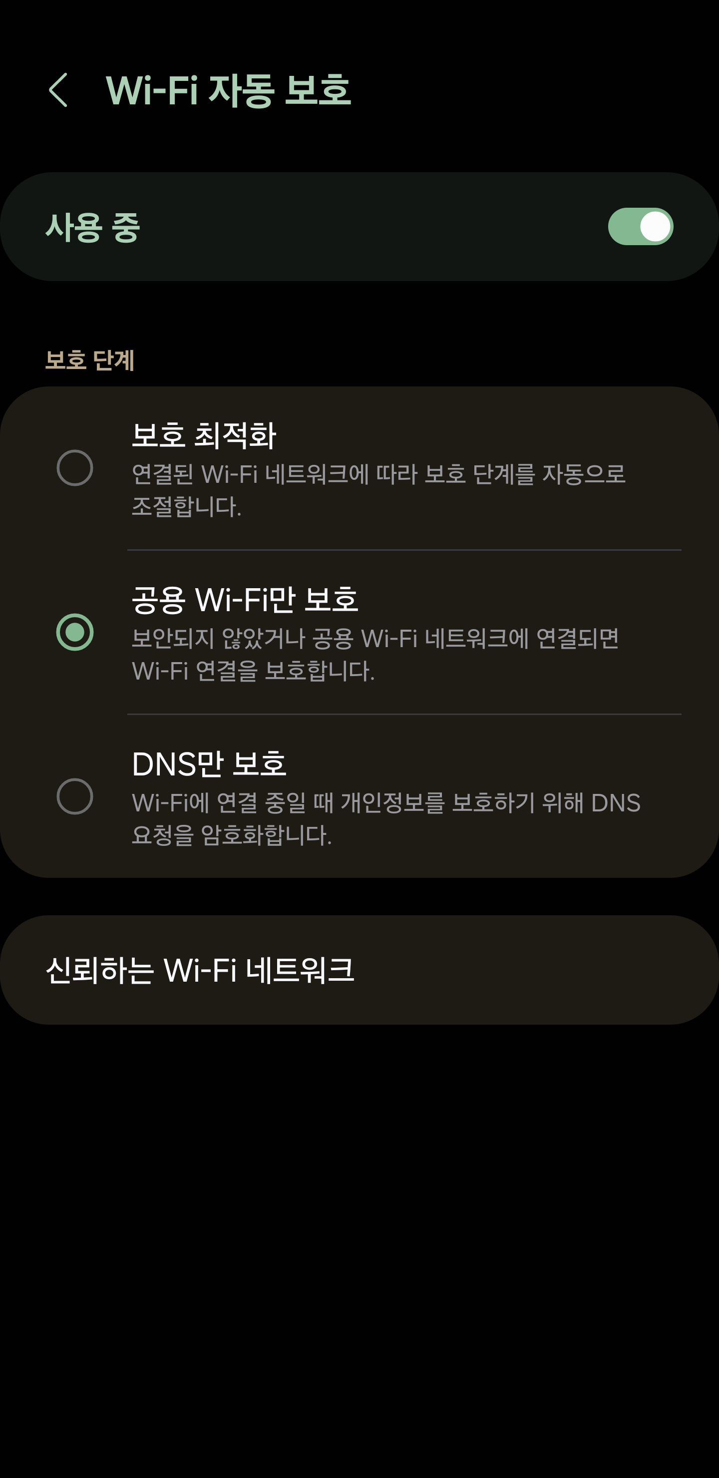 그러면 [보안 Wi-Fi] 메뉴를 보실 수 있습니다. 여기로 들어가보면 설정을 변경할 수 있는데, 여기에서 보호를 일시적으로 중단하거나, 혹은 아예 기능을 꺼버릴 수도 있습니다. 만약 평소에 이 기능을 사용하지만, 현재의 연결 자체는 신뢰할 수 있다고 판단하는 경우 (예: 집에서 사용하는 와이파이) [신뢰하는 Wi-Fi 네트워크]에 등록하여, 해당 연결시에는 보안 와이파이 기능이 동작하지 않도록 할 수도 있습니다.