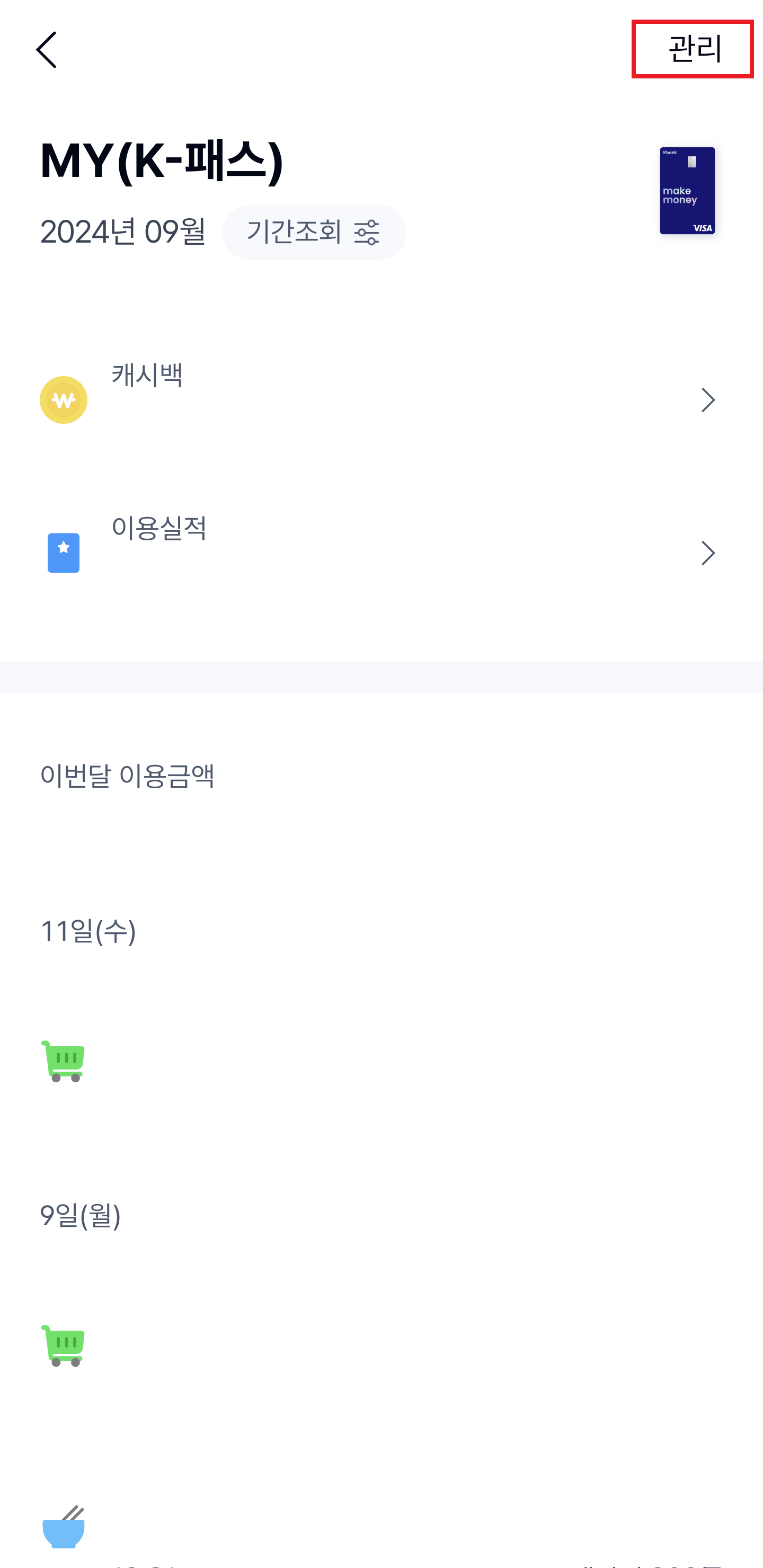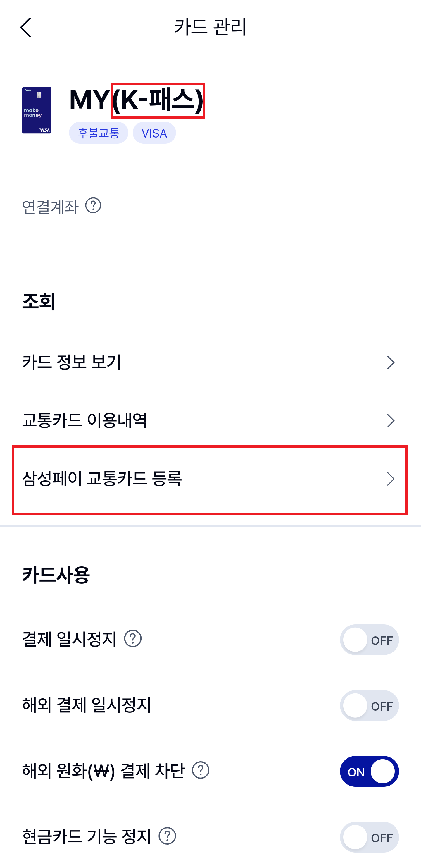 그리고 오른쪽 위의 '관리' 항목으로 들어가보면 '삼성페이 교통카드 등록' 이라는 메뉴가 별도로 나와 있는 걸 볼 수 있어요! 이게 케이뱅크 카드는 삼성페이에 교통카드로 등록시 별도의 가상의 카드를 생성하는 방식으로 사용된다고 하더라구요-